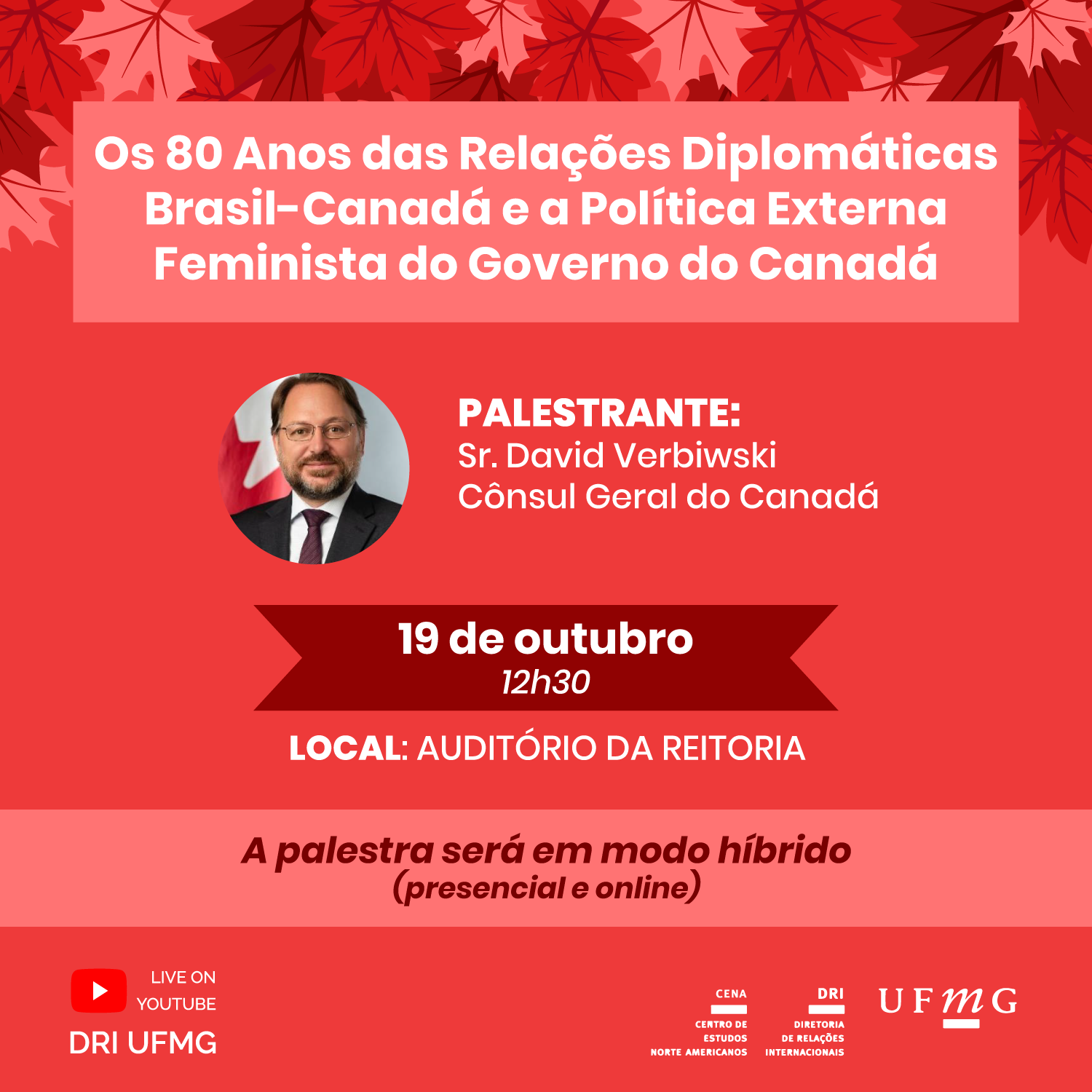 A Diretoria de Relações Internacionais com o apoio do Centro de Estudos Norte-Americanos convida a todos para a palestra “Os 80 Anos das Relações Diplomáticas Brasil-Canadá e a Política Externa Feminista do Governo do Canadá”, promovida pelo Consulado Geral do Canadá, que contará com a presença do excelentíssimo senhor cônsul do Canadá David Verbiwski.