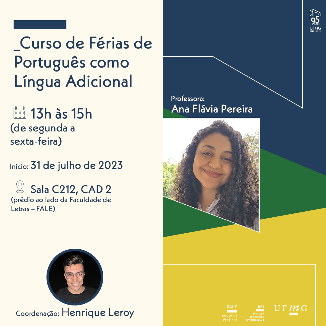 O curso, ministrado pela professora Ana Flávia Pereira (FALE/UFMG) e coordenado pelo professor Henrique Leroy (FALE/UFMG), terá início no dia 31 de julho de 2023 e se estenderá ao longo de duas semanas, terminando no dia 11 de agosto de 2023.