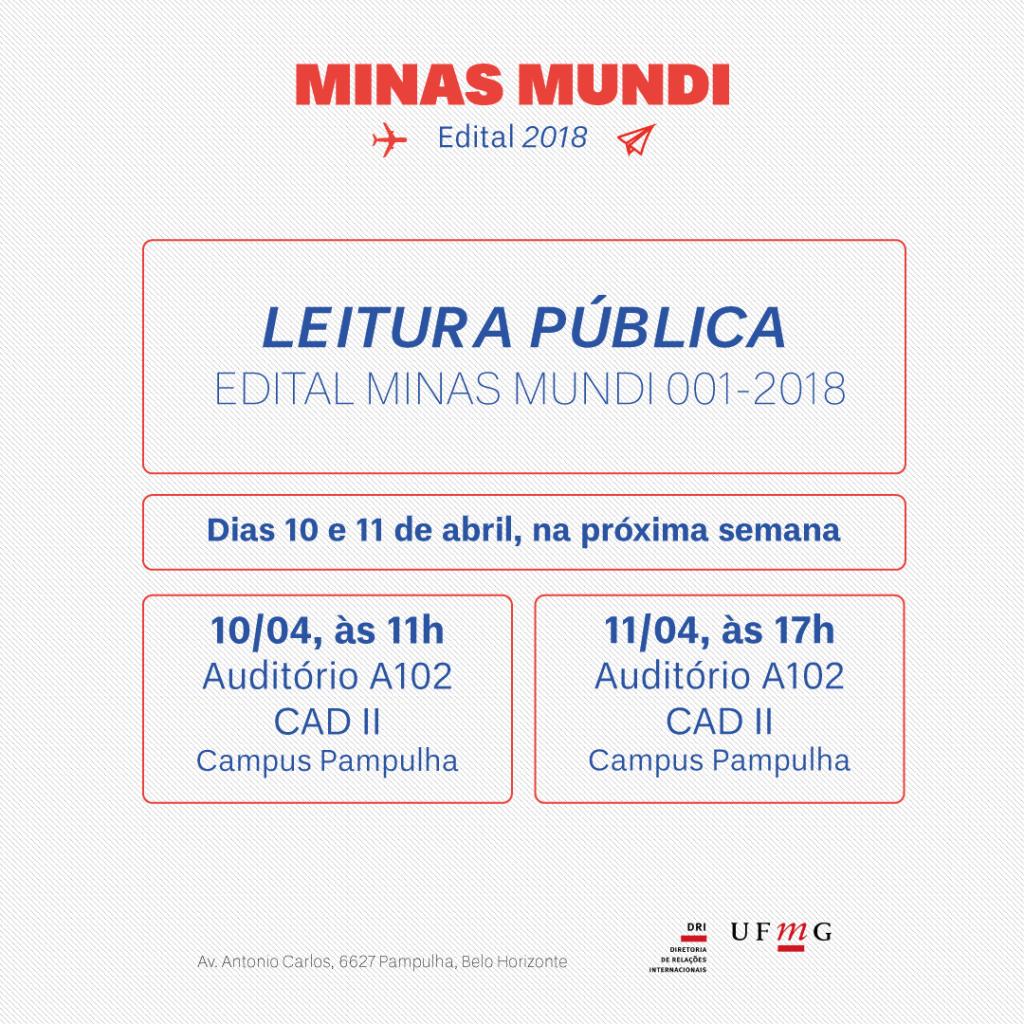 Na próxima semana, dias 10 e 11 de abril, a equipe Minas Mundi realizará a leitura pública do Edital Minas Mundi com o objetivo de explicar as etapas do processo seletivo do Programa Minas Mundi e tirar dúvidas dos estudantes.