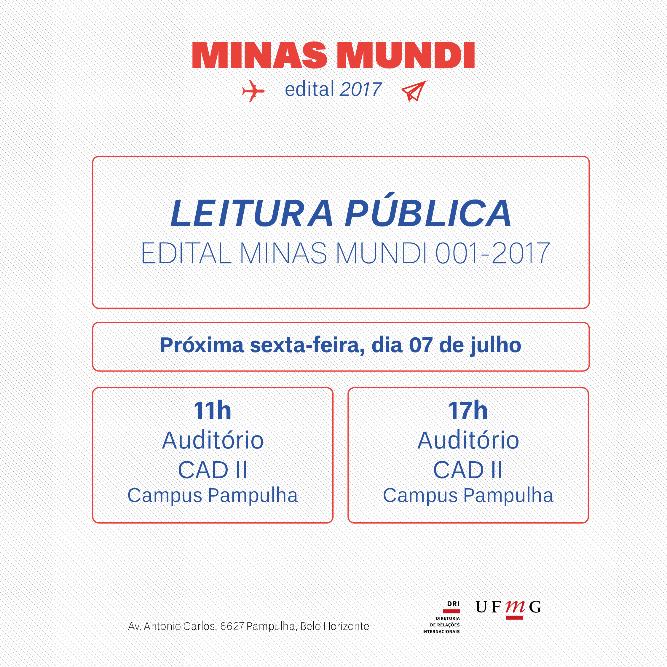 Promovido pela Diretoria de Relações Internacionais da UFMG, o encontro acontecerá no auditório do CAD II, localizado no Campus Pampulha, às 11 e às 17:00, e será uma ótima oportunidade para que os estudantes tenham acesso a informações completas, tendo em vista o período de inscrições do edital, que se aproxima, e vai do dia 17 a 20 de julho de 2017.