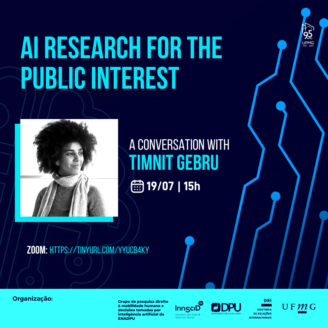 A Diretoria de Relações Internacionais (DRI) da UFMG em parceria com o Grupo de pesquisa direito à mobilidade humana e decisões tomadas por inteligência artificial da Escola Nacional da Defensoria Pública da União (ENADPU) e com Innovation and Science Diplomacy School (Innscid) convidam a todos para a palestra: “AI Research for the public interest”, uma conversa com Timnit Gebru sobre a pesquisa de inteligência artificial para o interesse público.