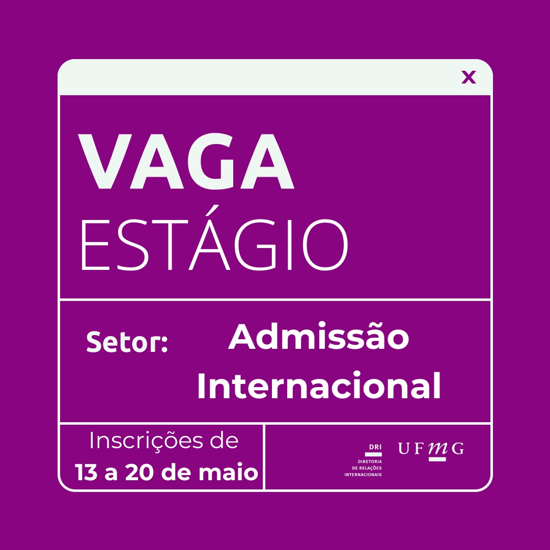 Estão abertas as inscrições, no período de 13 a 20 de maio, para seleção de candidatos(as) a 2 (duas) vagas de estágio não obrigatório (20 horas semanais) – para atuação no Setor de Admissão Internacional da Diretoria de Relações Internacionais da UFMG – DRI/UFMG.