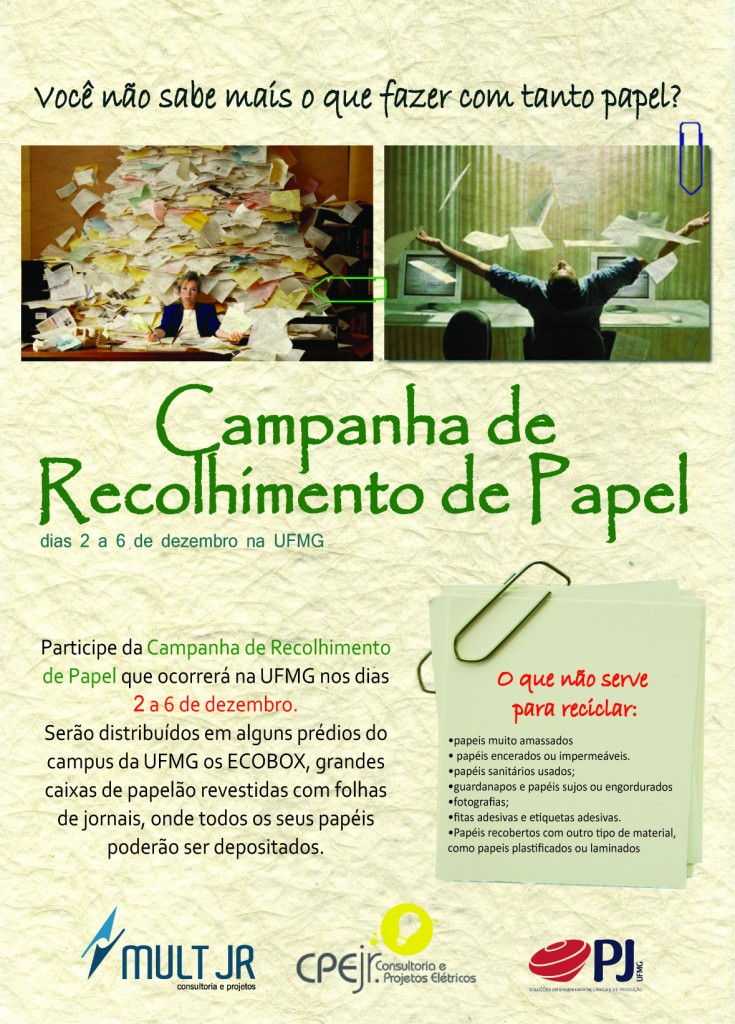 A empresa júnior do curso de Engenharia Química da UFMG, Mult Jr – Consultoria e Projetos, em parceria com a CPE Jr – Consultoria e Projetos Elétricos e a PJ – Consultoria & Assessoria, realizará entre os dias 02 e 06 de dezembro a Campanha de Recolhimento de Papel. O recolhimento dos materiais será feito por ecoboxes, grandes caixas de papelão revestidas com folhas de jornais, que serão distribuídos em vários prédios do Campus Pampulha.