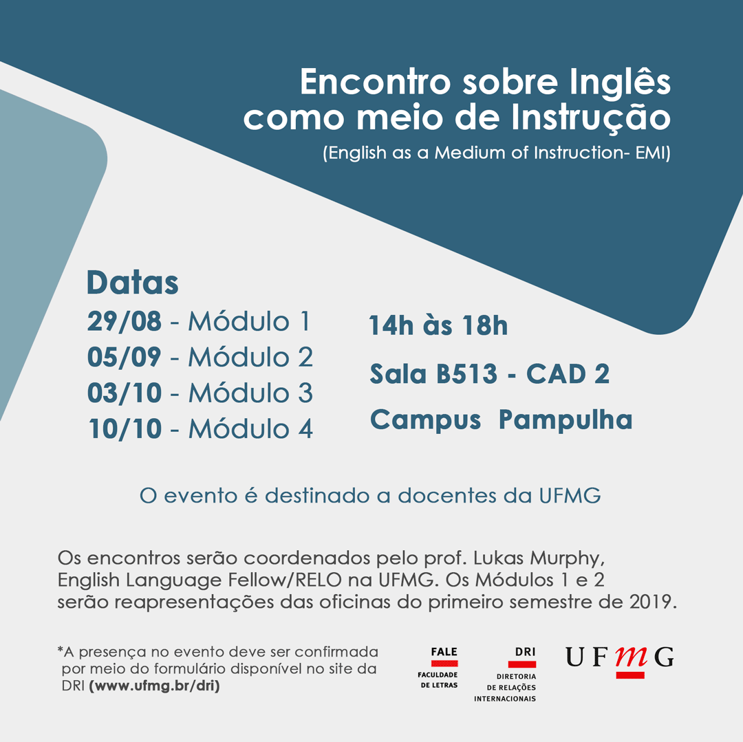 O Setor de Proficiência Linguística da DRI convida os docentes da Universidade Federal de Minas Gerais a participarem das novas edições do Encontro sobre Inglês como Meio de Instrução (English as a Medium of Instruction – EMI).