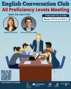 Neste primeiro encontro de 2025, os participantes terão a oportunidade de conhecer os novos English Teaching Assistants (ETAs Fulbright), Charlotte Greenhill e Fenner Dreyfuss-Wells. O English Conversation Club é uma iniciativa que incentiva os estudantes a aprimorarem suas habilidades de conversação em inglês por meio de encontros sobre diversos temas.