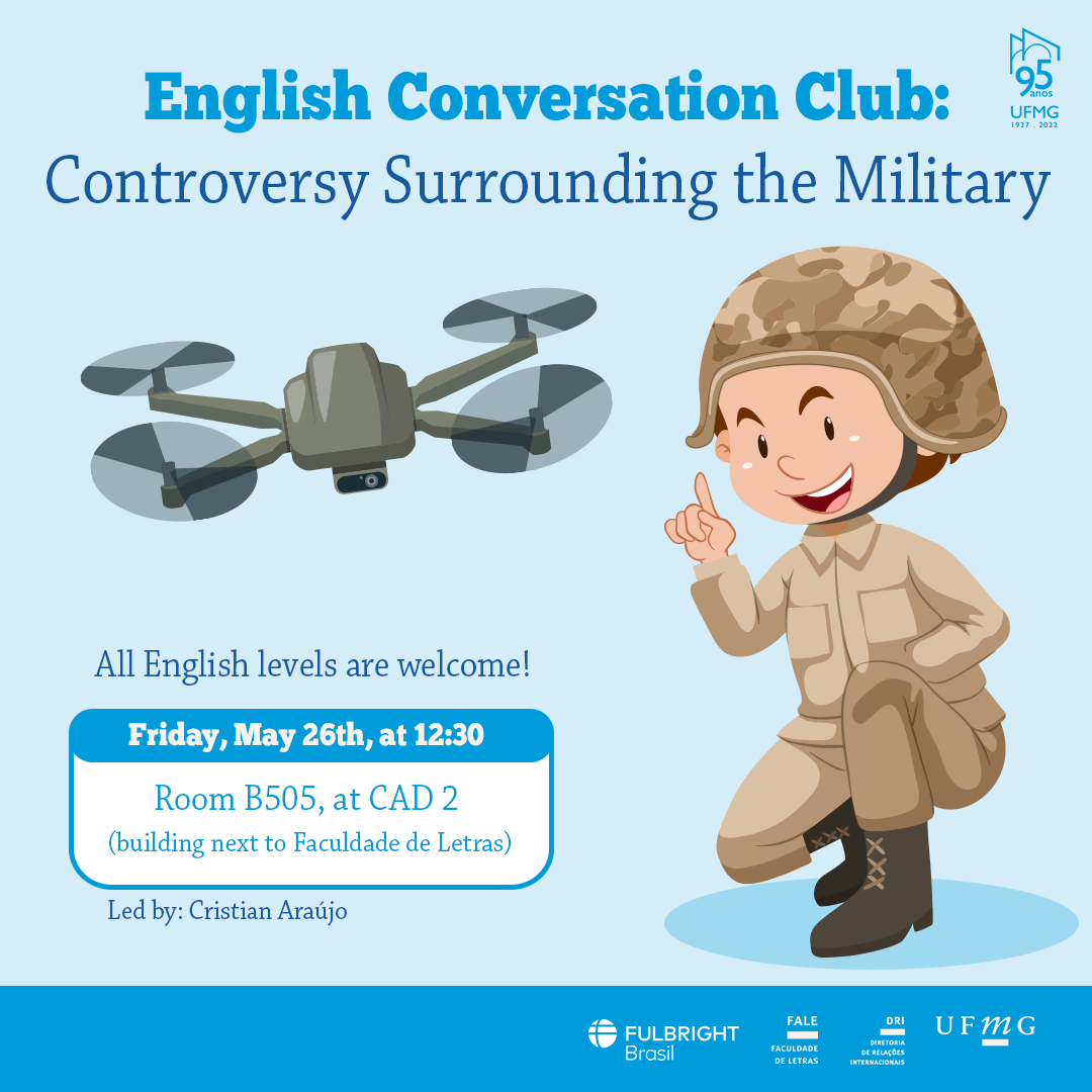 O Setor de Proficiência Linguística da Diretoria de Relações Internacionais convida a toda comunidade acadêmica a participar na quarta-feira, dia 26 de maio, às 12h30, de mais uma edição do “English Conversation Club”. O tema deste próximo encontro será “Controversy Surrounding the Military”, e o encontro será na sala B505 do CAD 2 (prédio ao lado da Faculdade de Letras).
