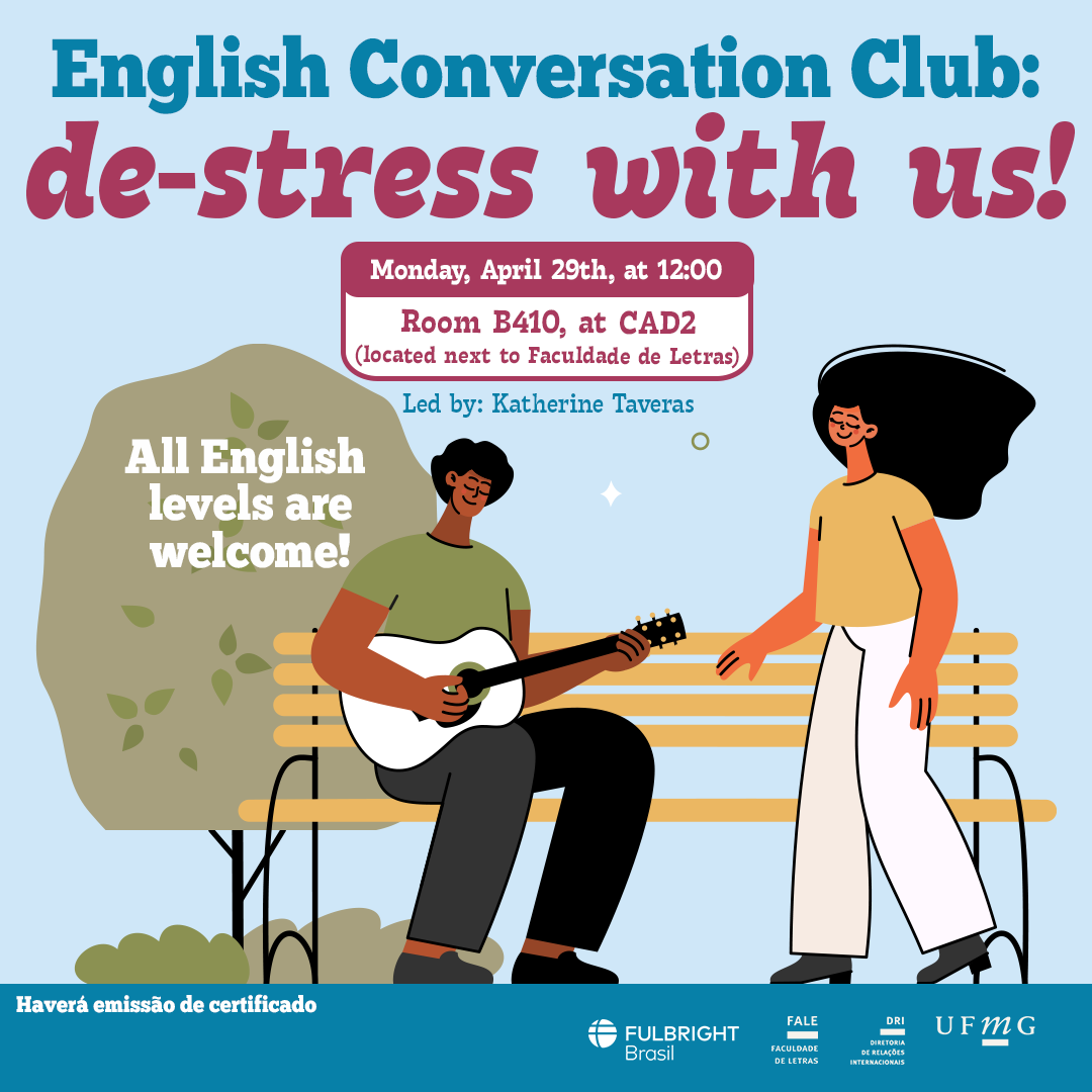 O “English Conversation Club” é uma iniciativa que estimula os estudantes a aprimorarem suas habilidades de conversação em língua inglesa, participando de encontros sobre diversos temas.