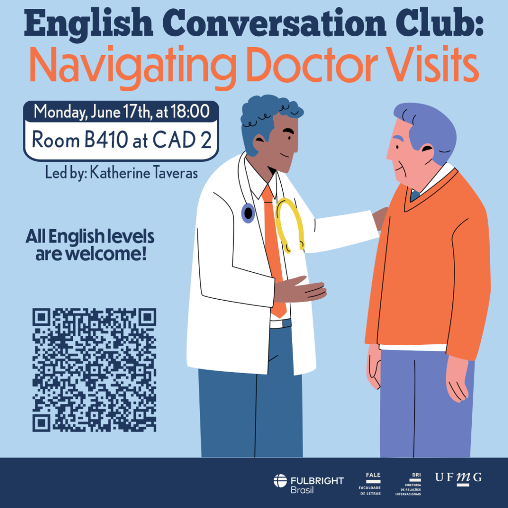 Neste encontro, com o tema “Navigating Doctor Visits”, os participantes poderão aprofundar o vocabulário referente à saúde, como descrever sintomas, anatomia e fisiologia humanas, marcar uma consulta e responder perguntas durante o atendimento médico.