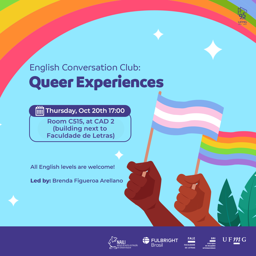 Na quinta-feira, dia 20 de outubro de 2022, às 17h, acontece mais uma edição do English Conversation Club. O tema será “Queer Experiences”, na sala C515 do CAD 2 (prédio ao lado da Faculdade de Letras).