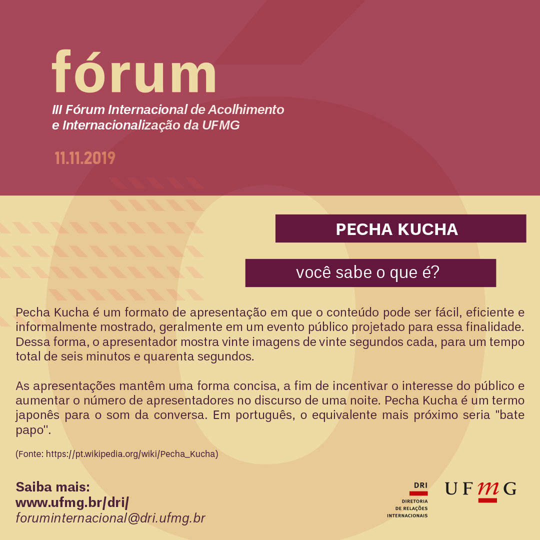 A inscrições para o Pecha Kucha e outras modalidades da terceira edição do Fórum Internacional de Acolhimento e Internacionalização da UFMG  podem ser realizadas aqui, até dia 20 de outubro.