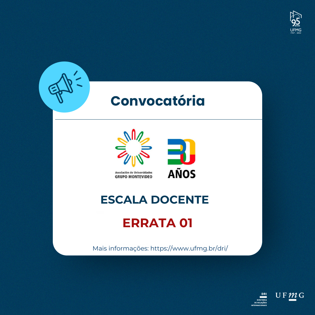 A Diretoria de Relações Internacionais (DRI) da Universidade Federal de Minas Gerais (UFMG) torna público a “Errata 01” referente à Chamada 05_2023 de seleção de docentes da UFMG para vagas do Programa de mobilidade acadêmica Escala Docente 2023, promovido no âmbito do acordo de cooperação entre a UFMG e a Associação de Universidades do Grupo Montevidéu (AUGM), publicada em 03 de maio de 2023, que prorroga as inscrições até o dia 28/05/2023.
