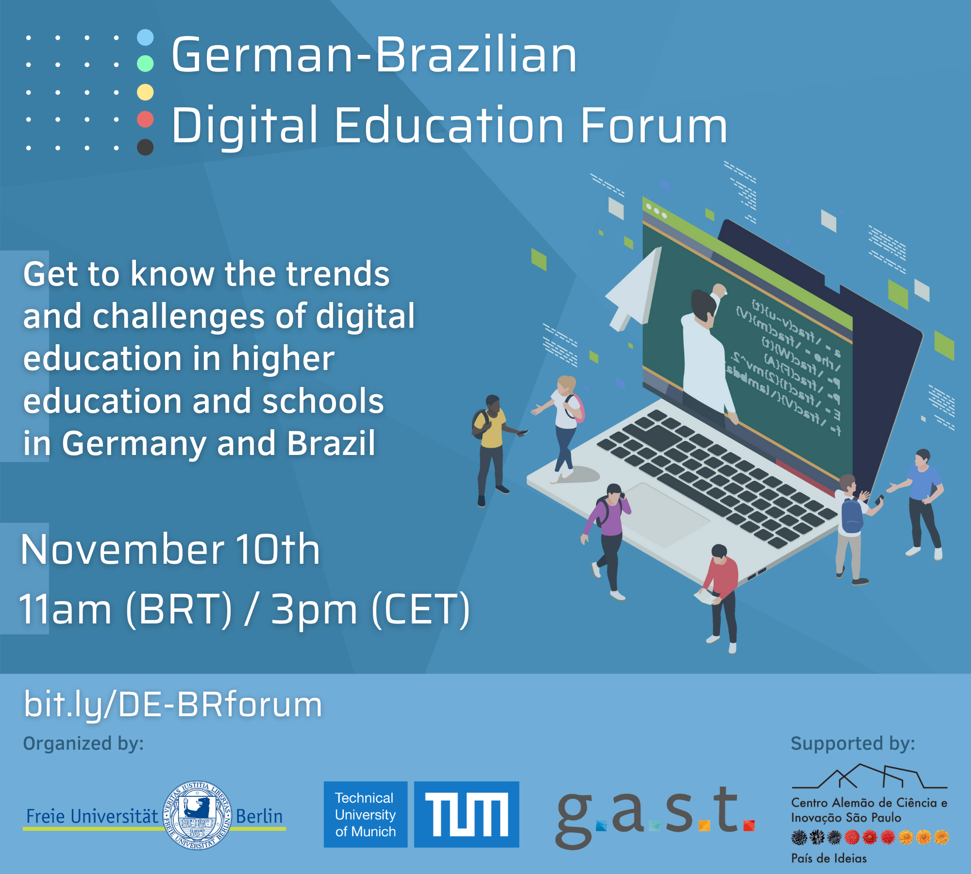 O German-Brazilian Digital Education Forum é um fórum gratuito com objetivo de promover o intercâmbio de experiências e ideias em relação à transformação digital no ensino, em ambos os países, pela plataforma Zoom. O Fórum contará com nove palestras, em inglês, de profissionais brasileiros e alemães. Todos os participantes, que assim desejarem, receberão um certificado de participação.