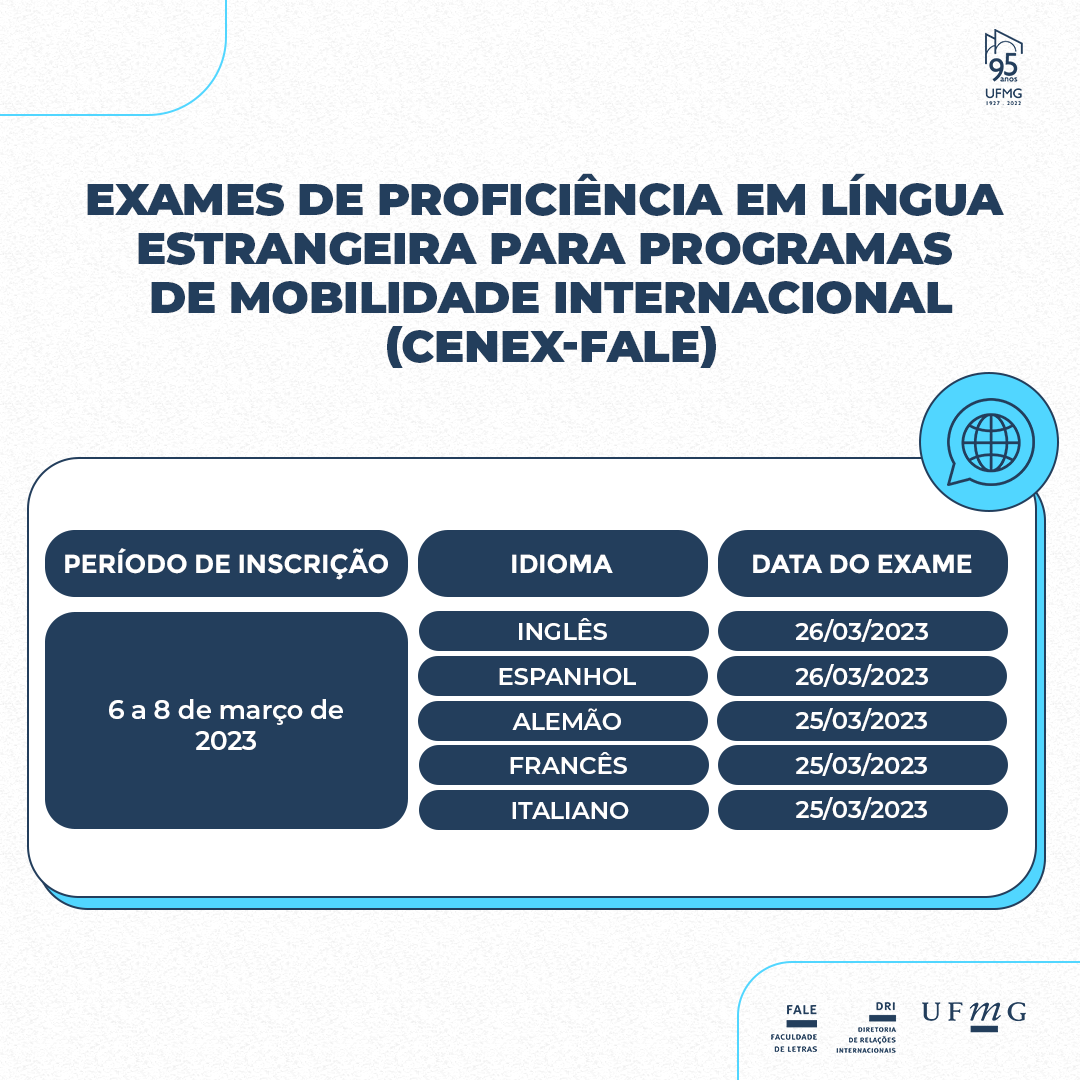 Todas as provas serão realizadas na modalidade presencial. Mais informações devem ser consultadas no site do CENEX, no qual estão disponíveis o Edital e o Calendário de provas dos exames de proficiência em língua estrangeira para programas de mobilidade internacional da UFMG.