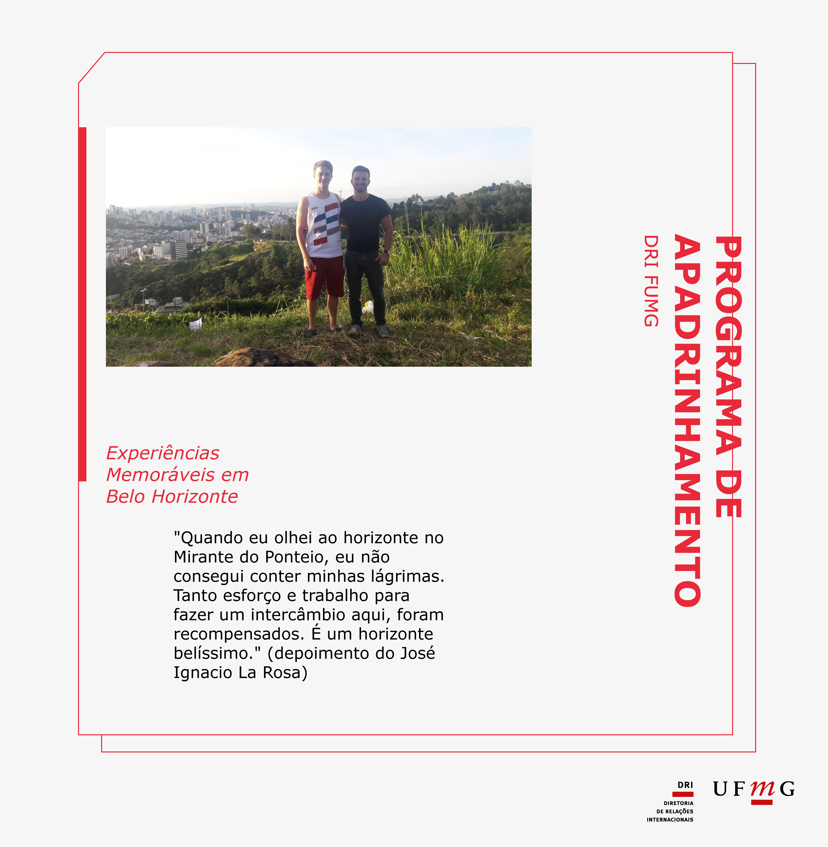 O padrinho Rafael Picinin, aluno da Faculdade de Letras, acompanha o seu afilhado, o estudante internacional da UFMG José Ignacio La Rosa, ao Mirante do Ponteio nas primeiras semanas em Belo Horizonte.