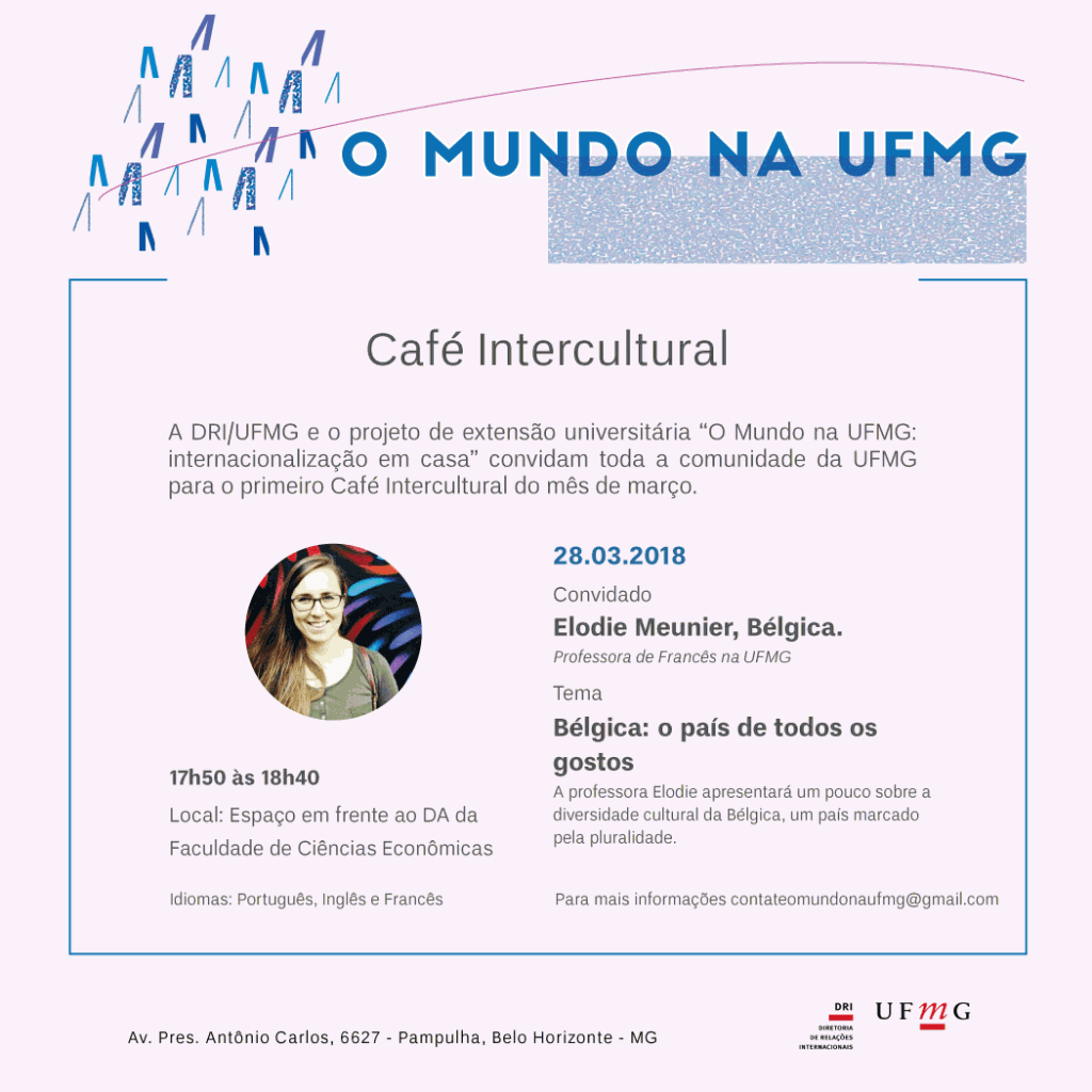 Promovido pelo Setor de Acolhimento da Diretoria de Relações Internacionais (DRI) da UFMG, no dia 28 de março, quarta-feira, acontece uma nova edição do Café Intercultural. A atividade tem início às 17h50, em frente ao Diretório Acadêmico da Faculdade de Ciências Econômicas.