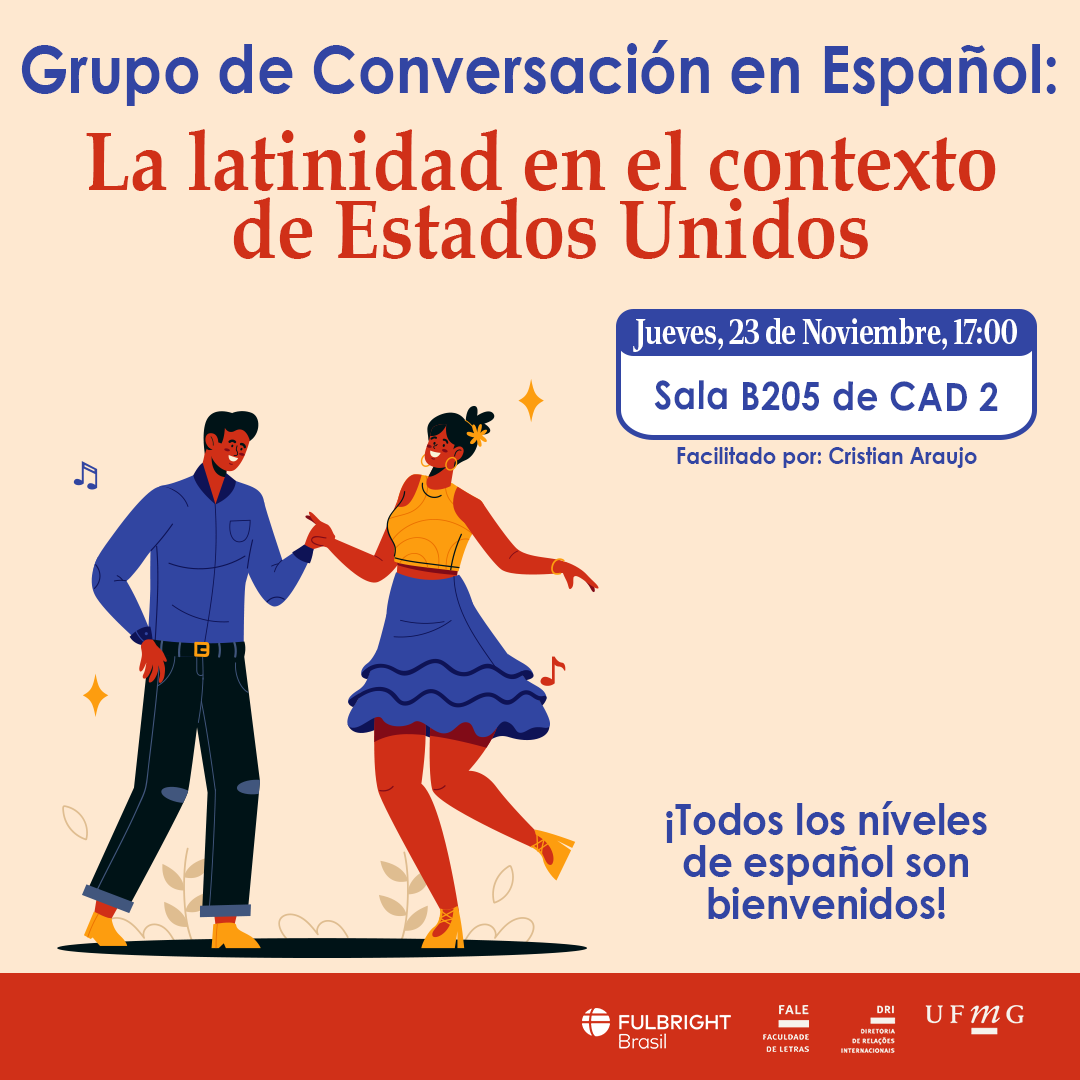 A atividade, voltada para a prática do idioma espanhol, será conduzida por Cristian Araujo, assistente de ensino em língua inglesa da UFMG pela Fulbright (ETA/Fulbright). Neste próximo encontro os participantes poderão conhecer e discutir sobre as representações das identidades latinas nos Estados Unidos.