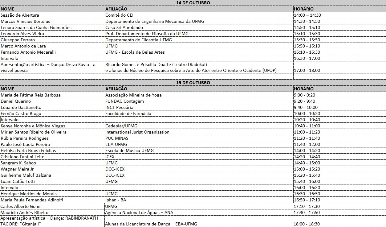 Mais informações sobre as palestras podem ser obtidas aqui. Para informações sobre a apresentação artística da dança Drsya Kavia – a visível poesia, que ocorrerá no dia 14 de outubro às 17:00, clique aqui.