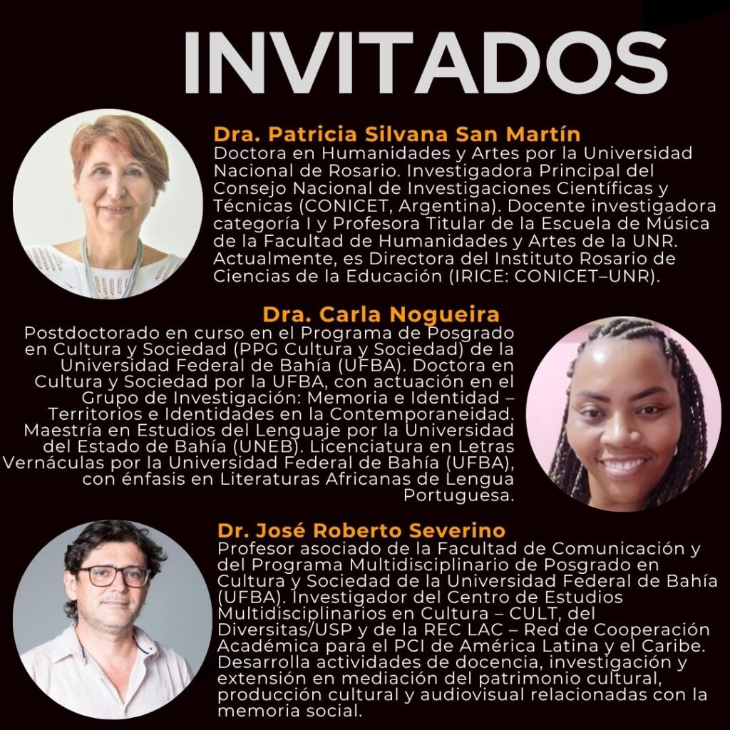 Participam deste webinar a Dra. Patricia Silvana San Martín, Professora da Universidade Nacional de Rosário (UNR), pesquisadora do Conselho Nacional de Pesquisas Científicas e Técnicas (CONICET) e Diretora do Instituto Rosário de Ciências da Educação (CONICET-UNR); a Dra. Carla Nogueira, Pós-Doutorada do Programa de Pós-Graduação em Cultura e Sociedade da Universidade Federal da Bahia; e o nosso convidado Dr. José Roberto Severino, Professor Associado da Universidade Federal da Bahia e pesquisador do Centro de Estudos Multidisciplinares em Cultura e da Rede de Cooperação Acadêmica para o Patrimônio Cultural Imaterial da América Latina e do Caribe. O evento será moderado pelo Dr. André Luis Ramos Soares, Professor do Programa de Pós-Graduação em Patrimônio Cultural da Universidade Federal de Santa Maria.