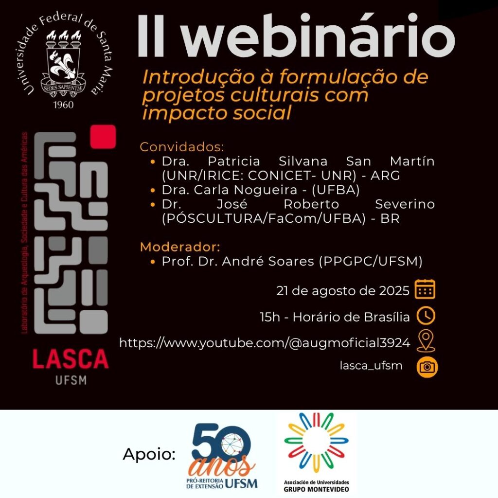 O Observatório do Patrimônio, Lugares, Humanidades e Artes (OPLHAr) da Associação de Universidades do Grupo Montevidéu (AUGM) convida a comunidade universitária da região a participar de seu segundo webinar, que terá como tema "Introdução à Formulação de Projetos Culturais com Impacto Social".  Quinta-feira, 21 de agosto, às 15h (Argentina, Uruguai, Brasília).  Participam deste webinar a Dra. Patricia Silvana San Martín, Professora da Universidade Nacional de Rosário (UNR), pesquisadora do Conselho Nacional de Pesquisas Científicas e Técnicas (CONICET) e Diretora do Instituto Rosário de Ciências da Educação (CONICET-UNR); a Dra. Carla Nogueira, Pós-Doutorada do Programa de Pós-Graduação em Cultura e Sociedade da Universidade Federal da Bahia; e o nosso convidado Dr. José Roberto Severino, Professor Associado da Universidade Federal da Bahia e pesquisador do Centro de Estudos Multidisciplinares em Cultura e da Rede de Cooperação Acadêmica para o Patrimônio Cultural Imaterial da América Latina e do Caribe. O evento será moderado pelo Dr. André Luis Ramos Soares, Professor do Programa de Pós-Graduação em Patrimônio Cultural da Universidade Federal de Santa Maria.  O evento será transmitido pelo canal da AUGM no YouTube.
