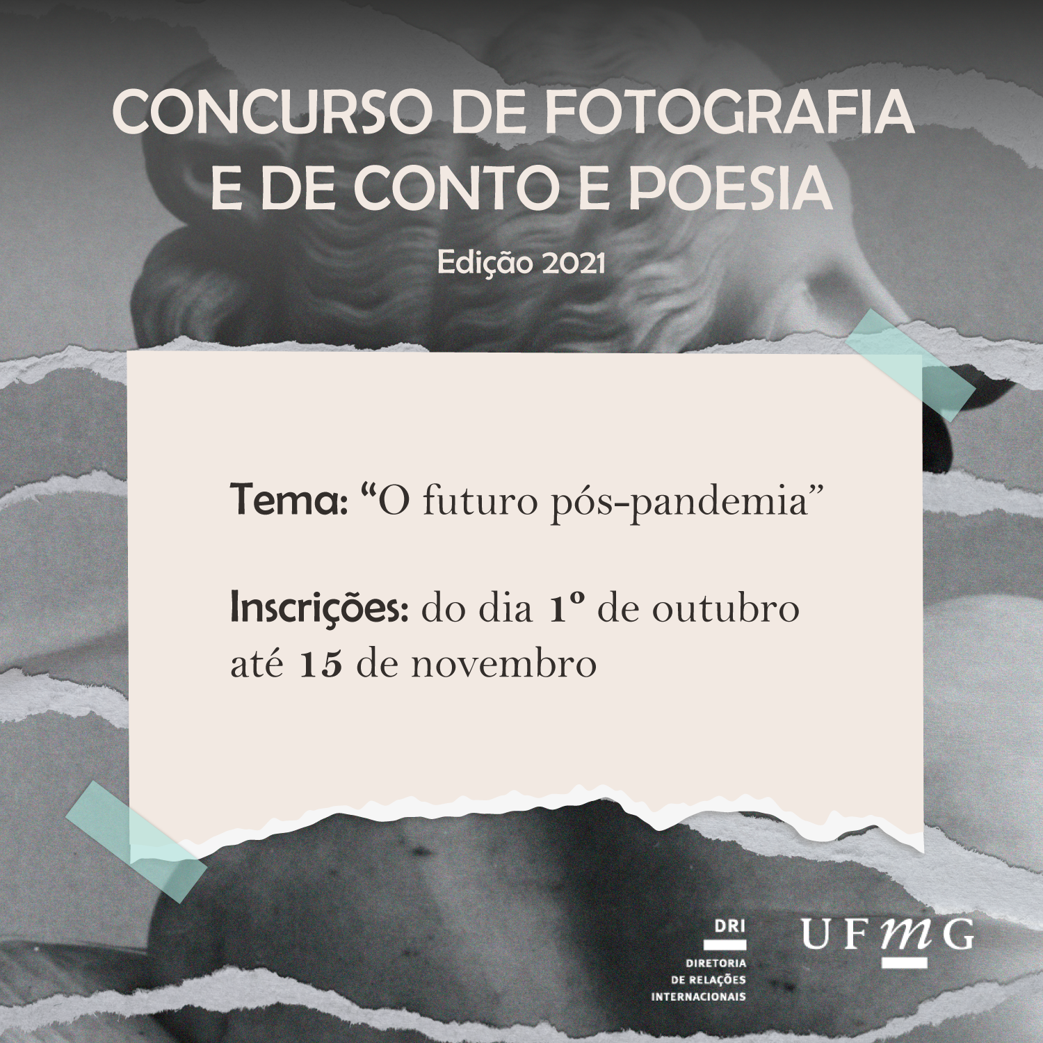 A Diretoria de Relações Internacionais (DRI) da Universidade Federal de Minas Gerais (UFMG) torna público a Chamada nº 10/2021 do Concurso de Fotografia e de Conto e Poesia – Edição 2021, com o tema “O futuro pós-pandemia”, que tem como objetivo a construção de memórias por meio de fotografias e da escrita, a partir da perspectiva de diferentes cenários, pontos de vista e vivências.