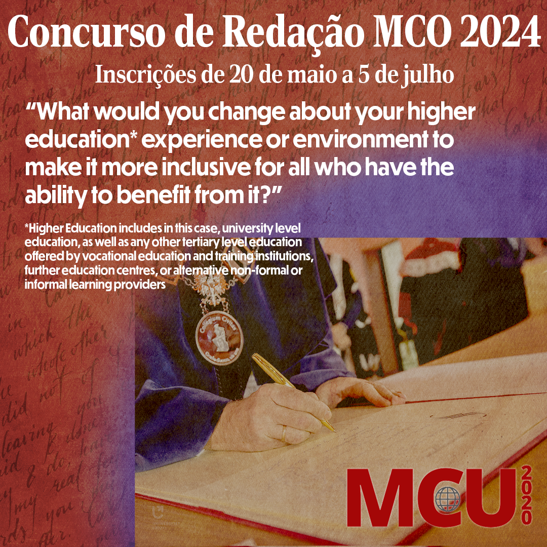 Replicando o sucesso do Concurso de Redação de 2023, a Magna Charta Observatory (MCO) tem o prazer de lançar a nova chamada para estudantes universitários de todo o mundo. Neste ano de 2024, a MCO convida os candidatos a refletirem sobre como o acesso à educação, com diversidade e inclusão agregadas em princípios de equidade e justiça, podem prevalecer no universo acadêmico. Para esta edição, a pergunta tema da redação será: