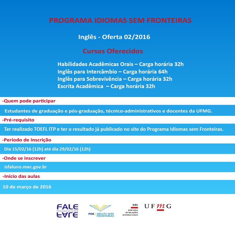 DRI - Diretoria de Relações Internacionais > Todas as notícias > Notícias > Inscrições abertas para curso de inglês gratuito do Programa Idiomas sem Fronteiras