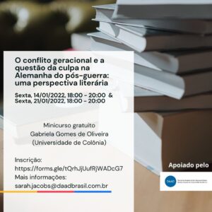 Nos dias 14 e 21 de janeiro de 2022, das 18:00 às 20:00 horas, a Professora Gabriela Gomes de Oliveira realizará um minicurso online sobre “O conflito geracional e a questão da culpa na Alemanha do pós-guerra: uma perspectiva literária”.