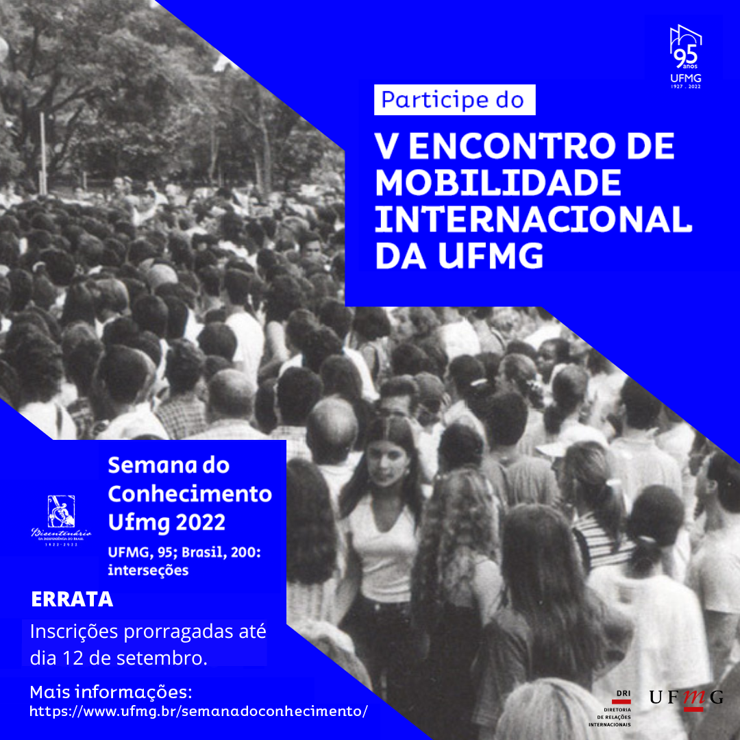 A Diretoria de Relações Internacionais (DRI) da Universidade Federal de Minas Gerais (UFMG) torna pública a Errata 01” referente à Chamada 12_2022 para o V Encontro de Mobilidade Internacional da UFMG, publicada em 23 de agosto de 2022, que prorroga o prazo das inscrições até o dia 12 de setembro.