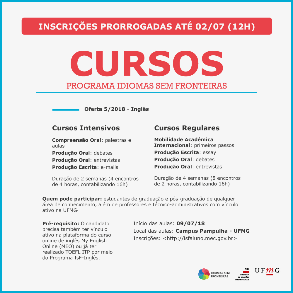 As inscrições para a oferta 5 dos cursos presenciais de inglês do Programa Idiomas sem Fronteiras foram prorrogadas até o dia 02 de julho.