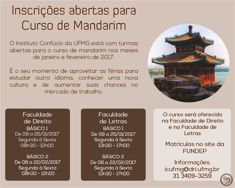 O Instituto Confúcio da UFMG irá oferecer cursos de mandarim nos meses de janeiro e fevereiro de 2017. Serão ofertadas vagas para quatro turmas dos níveis básicos 1 e 2 com carga horária de 52 horas.