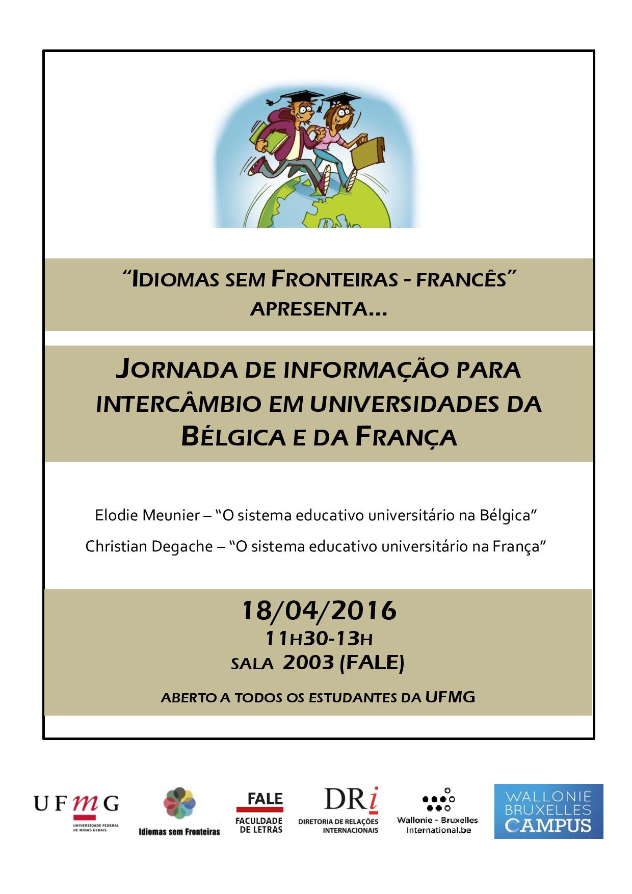 A Diretoria de Relações Internacionais da UFMG juntamente com o Programa Idiomas Sem Fronteiras convidam a todos os interessados em fazer mobilidade acadêmica para França ou Bélgica a participarem da Jornada de Informação para Intercâmbio em Universidades na França e na Bélgica. O evento também conta com o apoio da Faculdade de Letras da UFMG e do Campus Wallonie de Bruxelas.