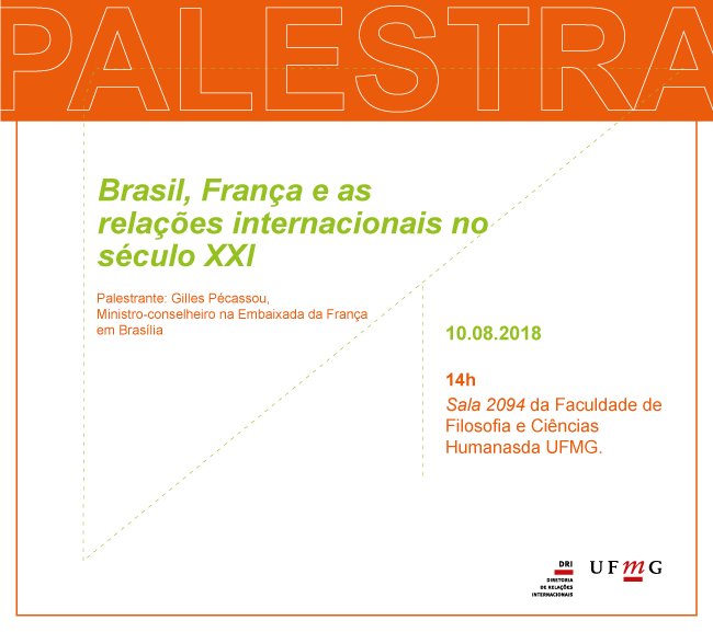 No dia 10 de agosto, próxima sexta-feira, Gilles Pécassou, ministro-conselheiro da Embaixada da França em Brasília, estará presente na sala 2094 da FAFICH, às 14horas, para proferir palestra sobre Brasil, França e as relações internacionais no século XXI.