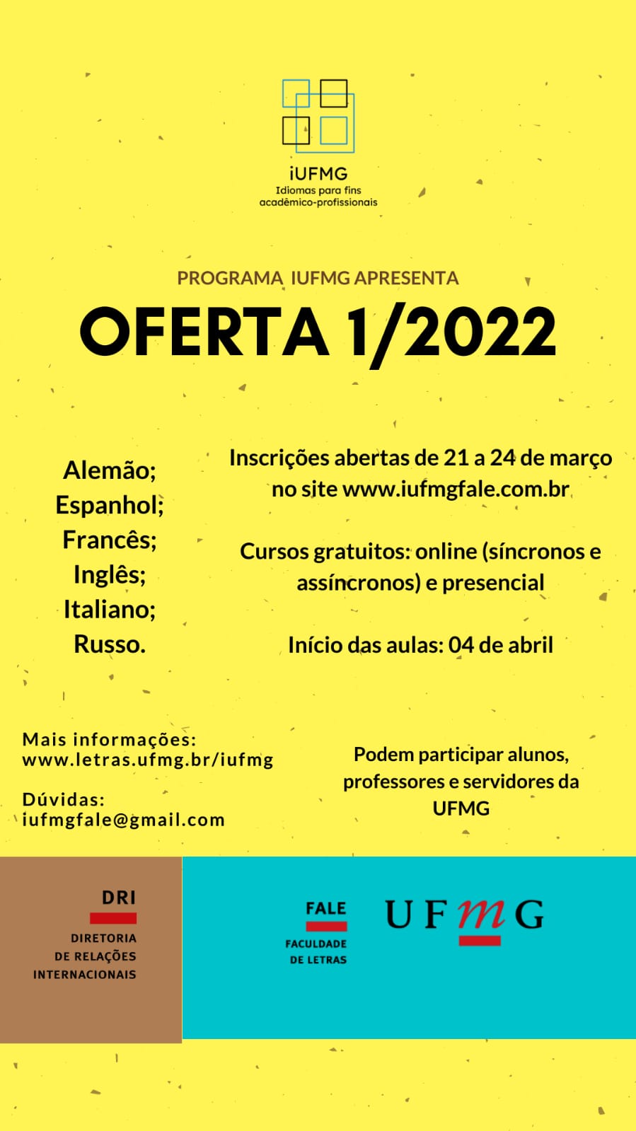O Programa Idiomas para fins acadêmico-profissionais (iUFMG) oferta cursos gratuitos intensivos de alemão, espanhol, francês, inglês, italiano e russo com foco no desenvolvimento de habilidades linguísticas, textuais e acadêmicas. Podem participar alunos, professores e servidores da UFMG.