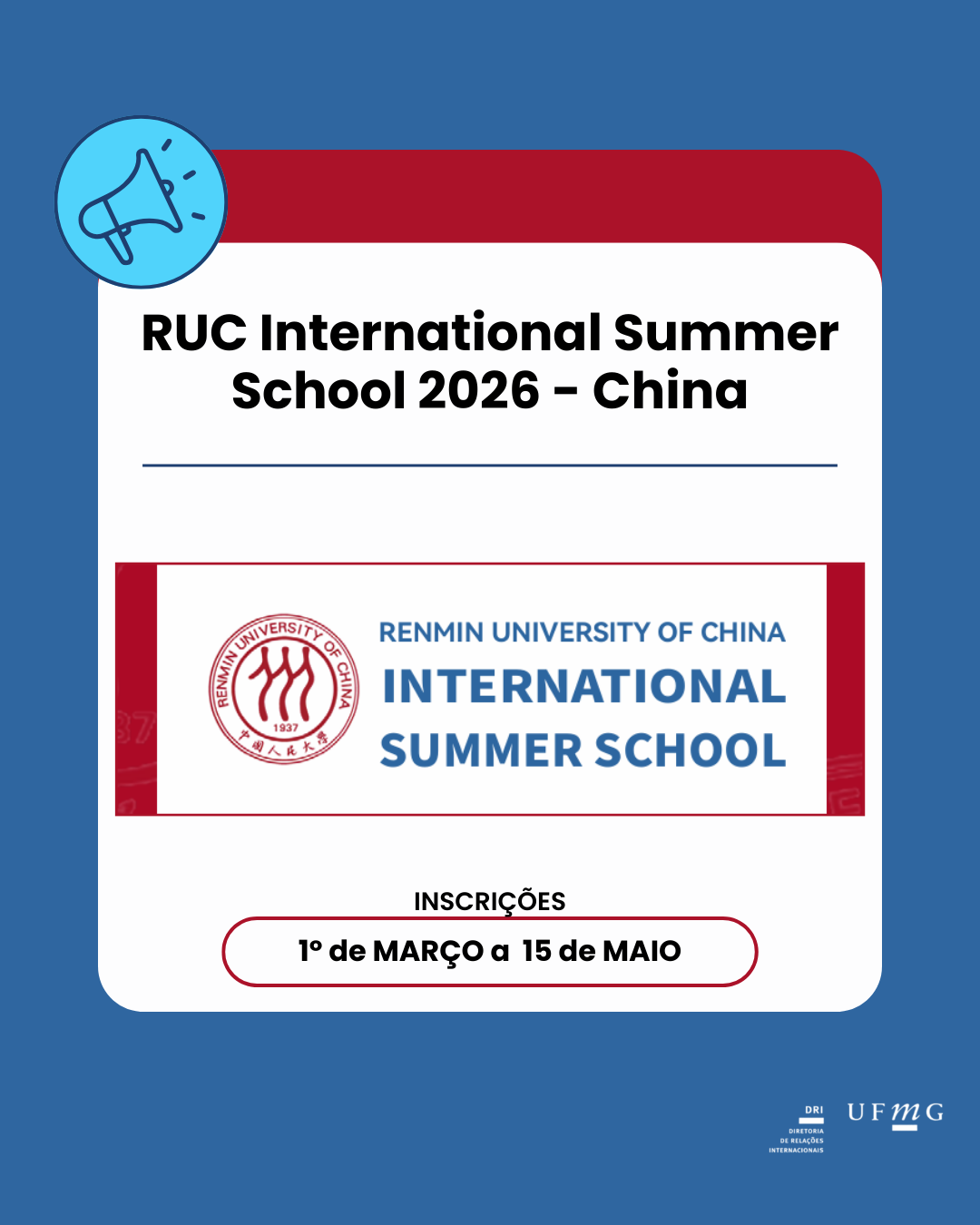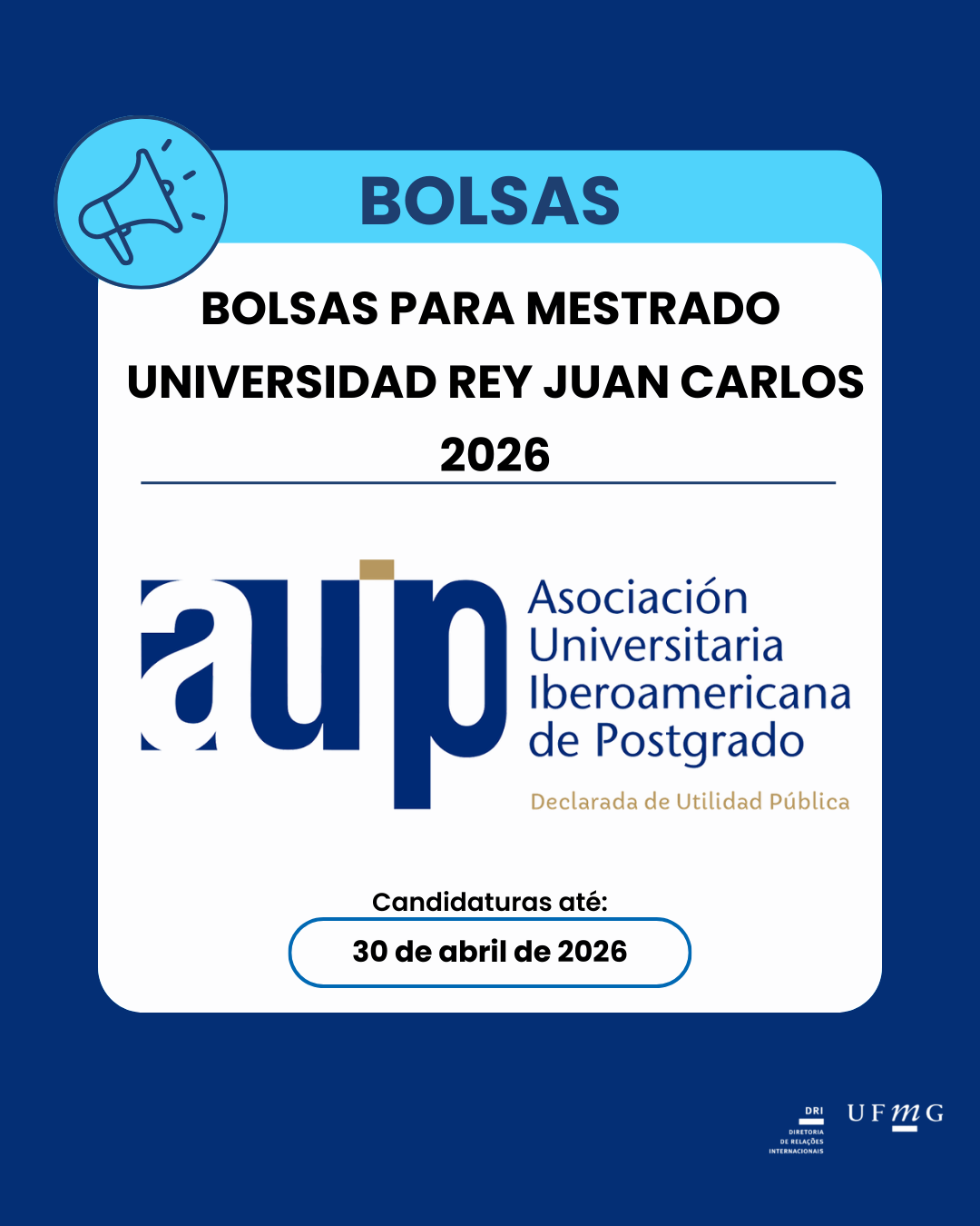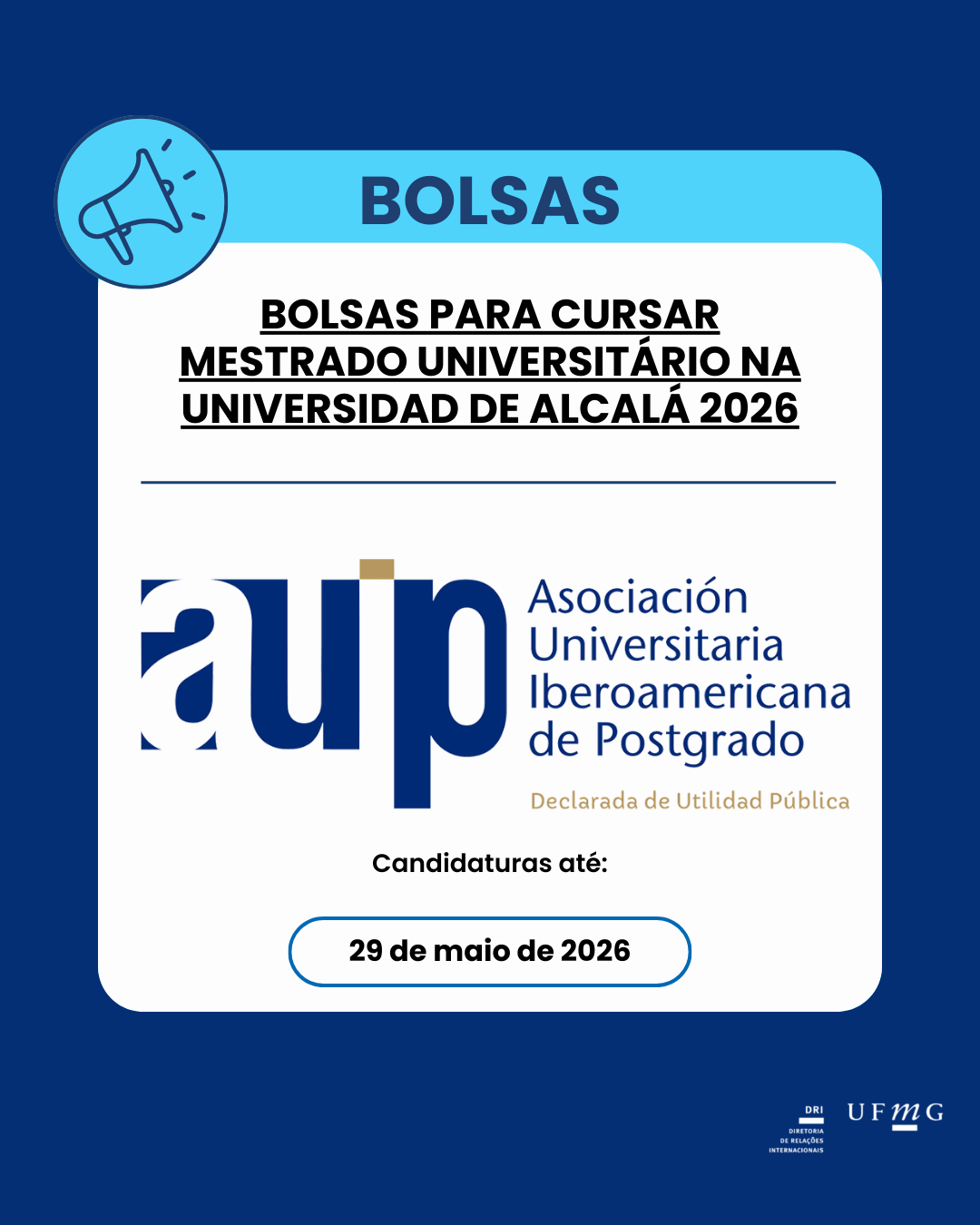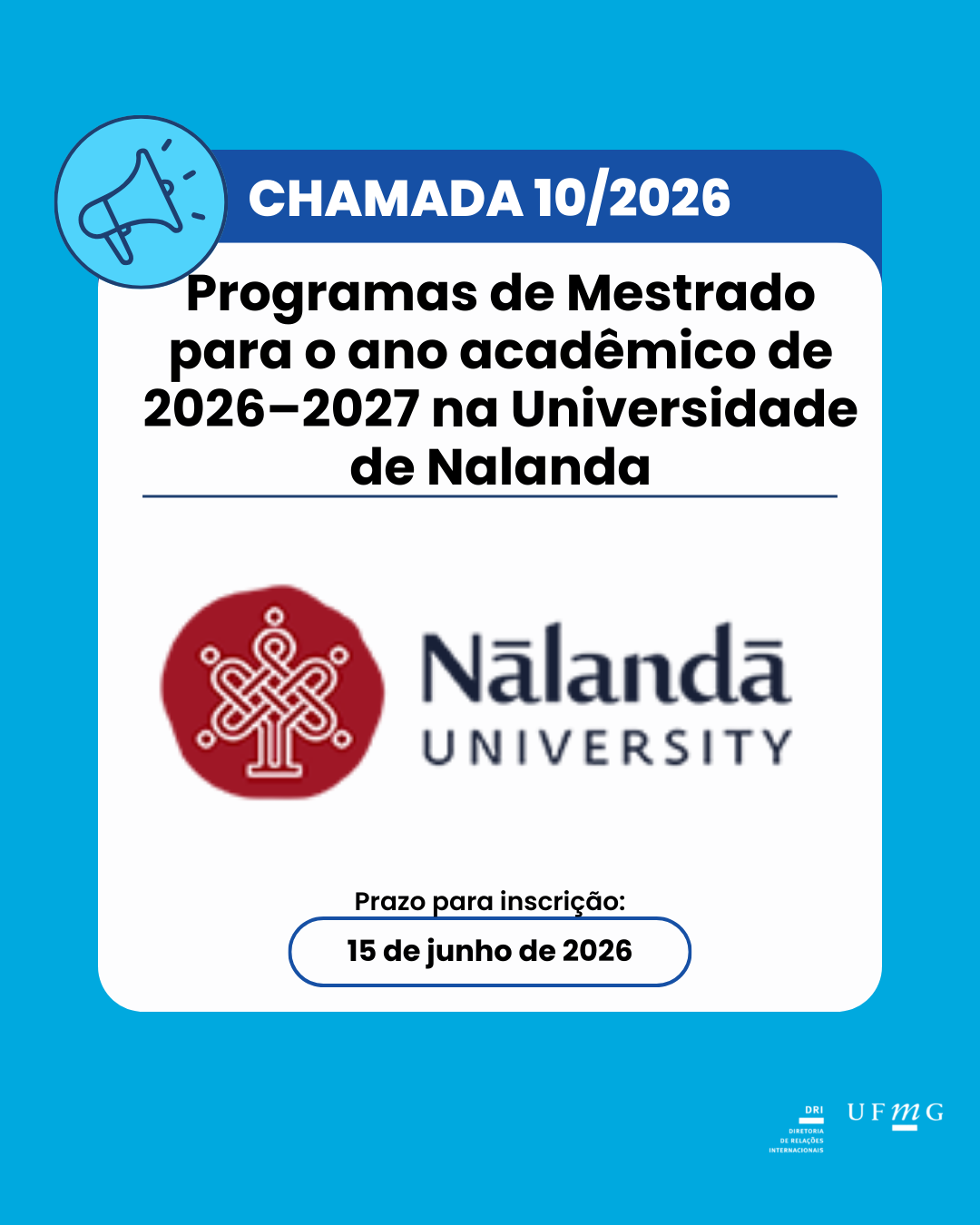 A Diretoria de Relações Internacionais (DRI) da Universidade Federal de Minas Gerais é um órgão assessor vinculado ao Gabinete do(a) Reitor(a). Tem como competência coordenar as ações institucionais voltadas à cooperação e ao intercâmbio desta Universidade com outras instituições de ensino superior, de pesquisa ou de fomento, sediadas em outros países ou que tenham atuação internacional.