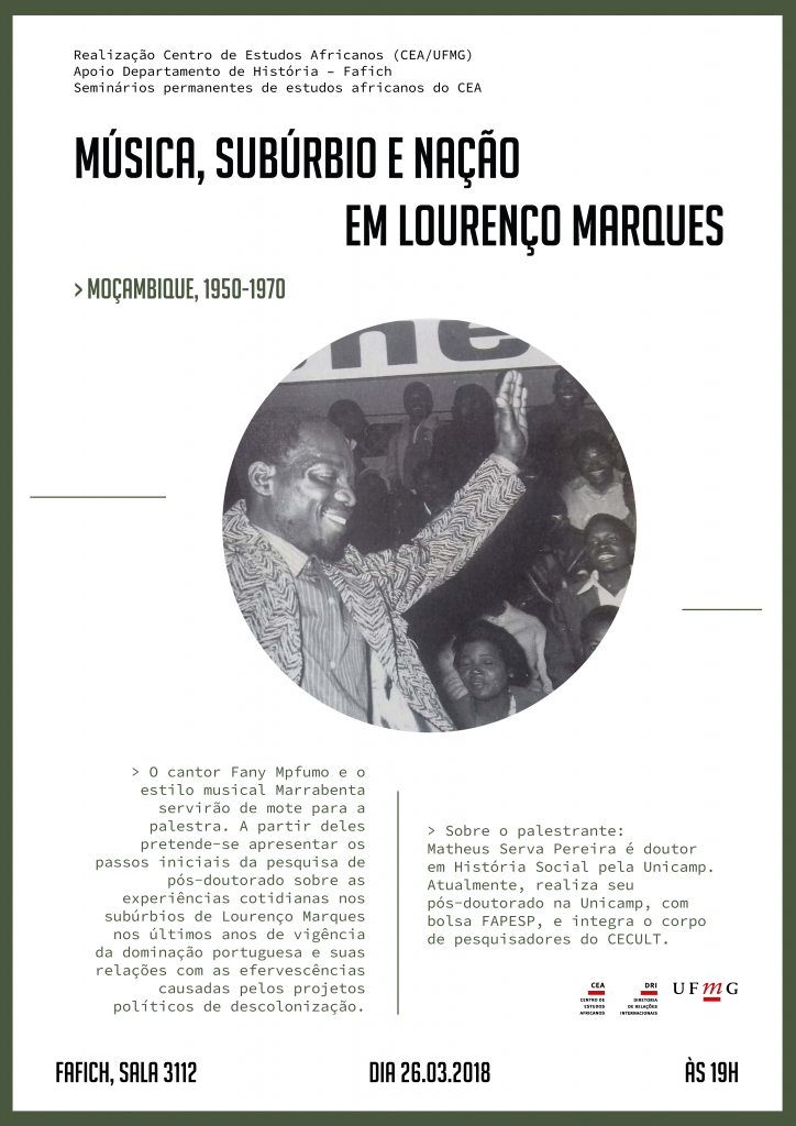O estilo musical marrabenta e o cantor Fany Mpfumo serão abordados, em palestra nesta segunda-feira, dia 26 de março, por Matheus Serva, que atualmente realiza o pós-doutorado na Unicamp, com bolsa FAPESP, e integra o corpo de pesquisadores do CECULT.