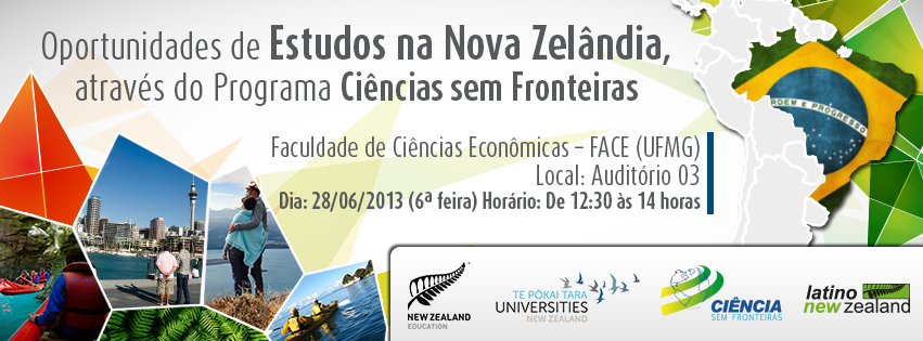Na próxima sexta-feira, dia 28 de junho, será realizada no auditório da FACE uma palestra sobre as oportunidades de estudo na Nova Zelândia. O evento ocorrerá entre 12:30 e 14:00 horas.