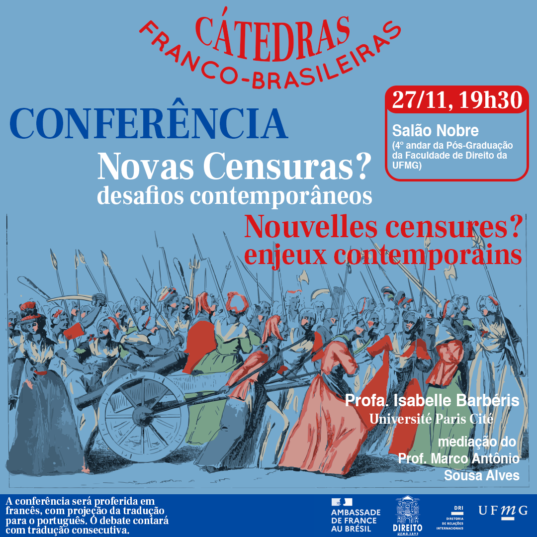 No âmbito da Cátedra Franco-Brasileira, a Rede Francófona da Faculdade de Direito da UFMG promove, com apoio da Diretoria de Relações Internacionais (DRI) da UFMG, a Conferência: Nouvelles censures ? : enjeux contemporains, referente à atividade complementar do turno noturno, conforme o calendário estabelecido pela PROGRAD/UFMG, dia 27 de novembro, das 19h30 às 21h30, no Salão Nobre – 4º andar do prédio da Pós-Graduação da Faculdade de Direito da UFMG.