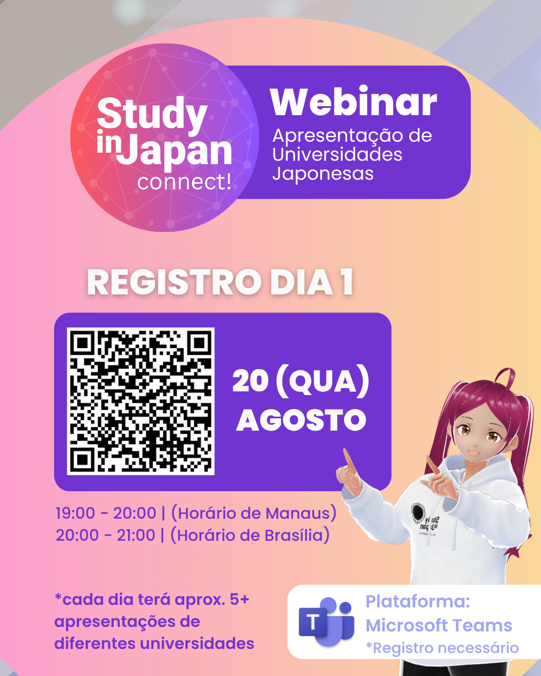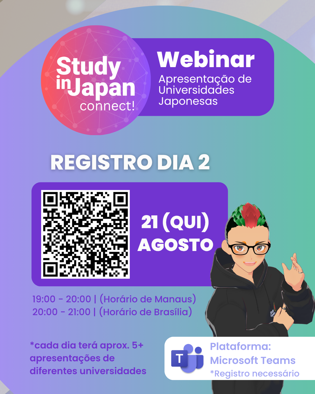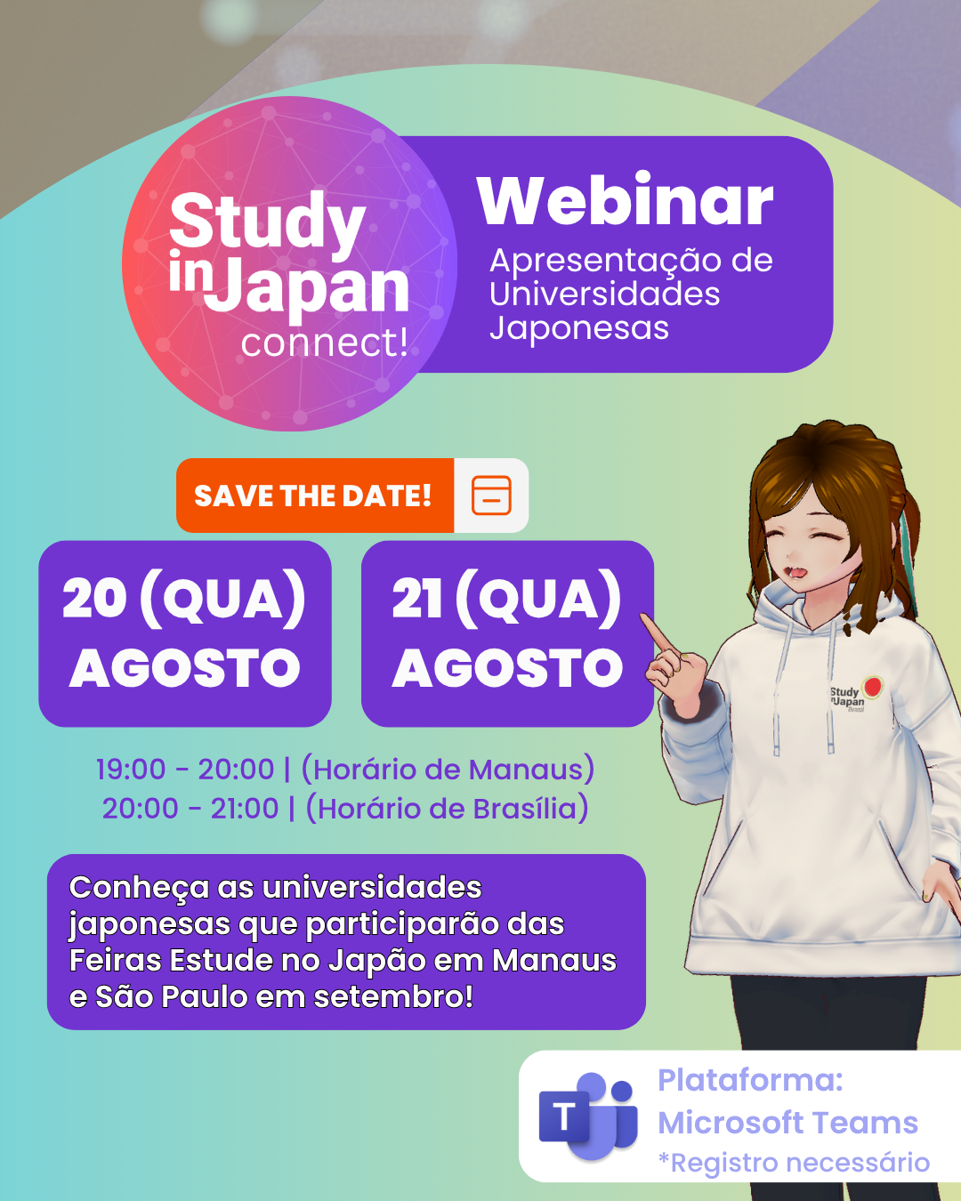 Participe dos webinários que ocorrerão nos dias 20 e 21 de agosto, das 20h às 21h (horário de Brasília) e apresentarão cerca de 10 universidades japonesas. Cada dia terá a participação de cinco universidades diferentes.