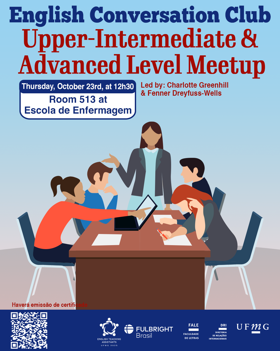 Upper-Intermediate & Advanced Level Meetup, dia 23/10, das 12h30 às 14h, na sala 513 na Escola de Enfermagem