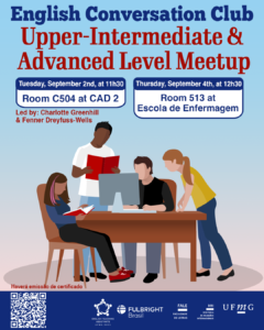 O English Conversation Club, conduzido por Charlotte Greenhill e Fenner Dreyfuss-Wells (English Teaching Assistants – ETAs Fulbright), é uma iniciativa que incentiva os estudantes a aprimorarem suas habilidades de conversação em inglês por meio de encontros sobre diversos temas.
