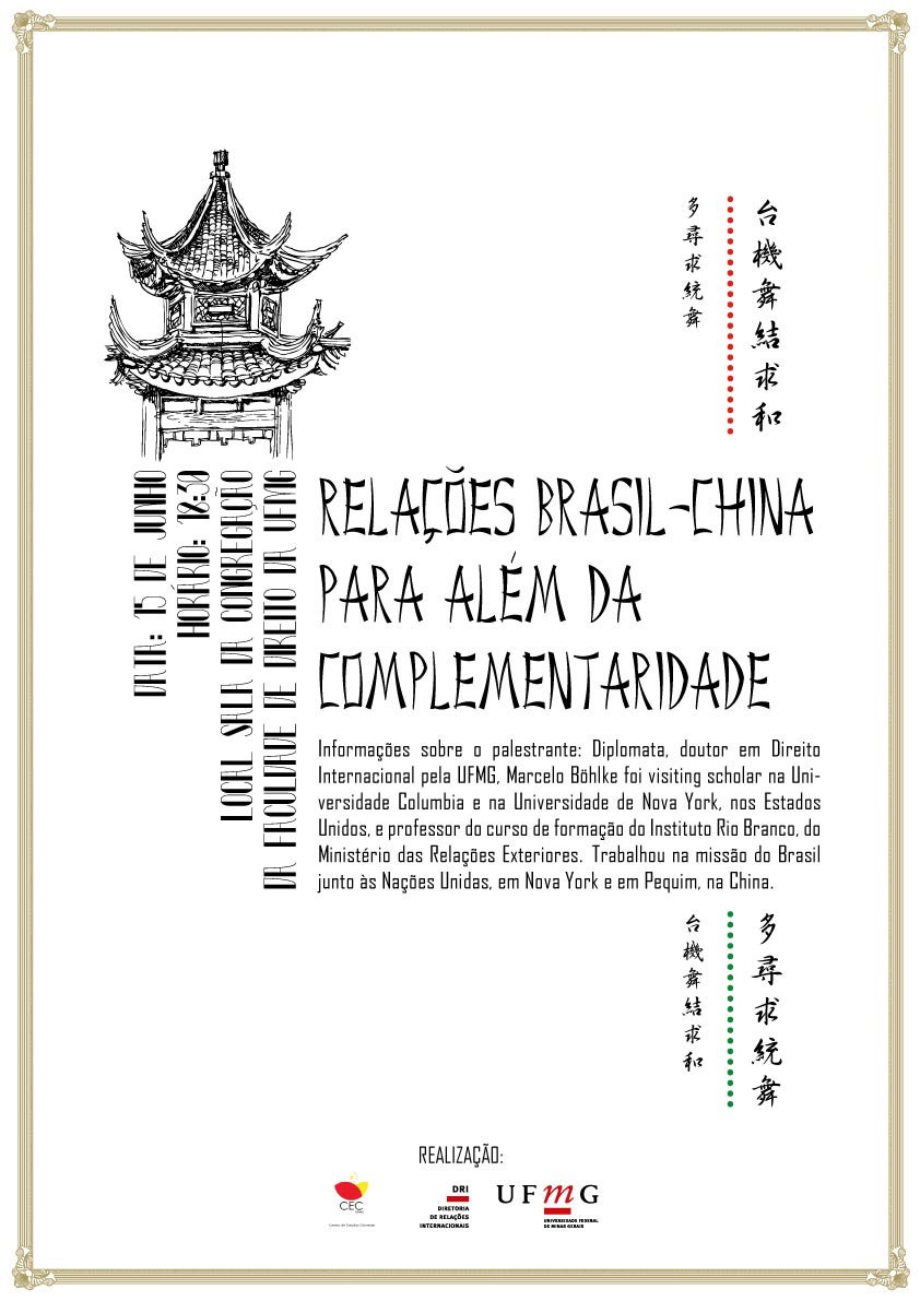 O seminário, intitulado de Relações Brasil-China para além da complementaridade, será apresentado por Marcelo Böhlke, diplomata e doutor em Direito Internacional da UFMG, às 18h30min, na Sala de Congregação da Faculdade de Direito da UFMG.
