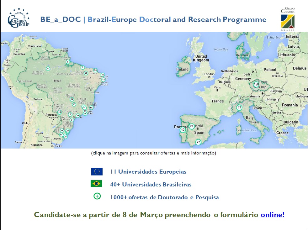 O Grupo Coimbra de Universidades Brasileiras realiza a primeira edição do Programa Be_A_DoC Brazil-Europe Doctoral and Research Program cujo objetivo é promover a mobilidade acadêmica entre as 72 universidades associadas ao GCUB e as 40 instituições que fazem parte do Coimbra Group, além do fortalecimento da cooperação universitária Brasil-Europa.