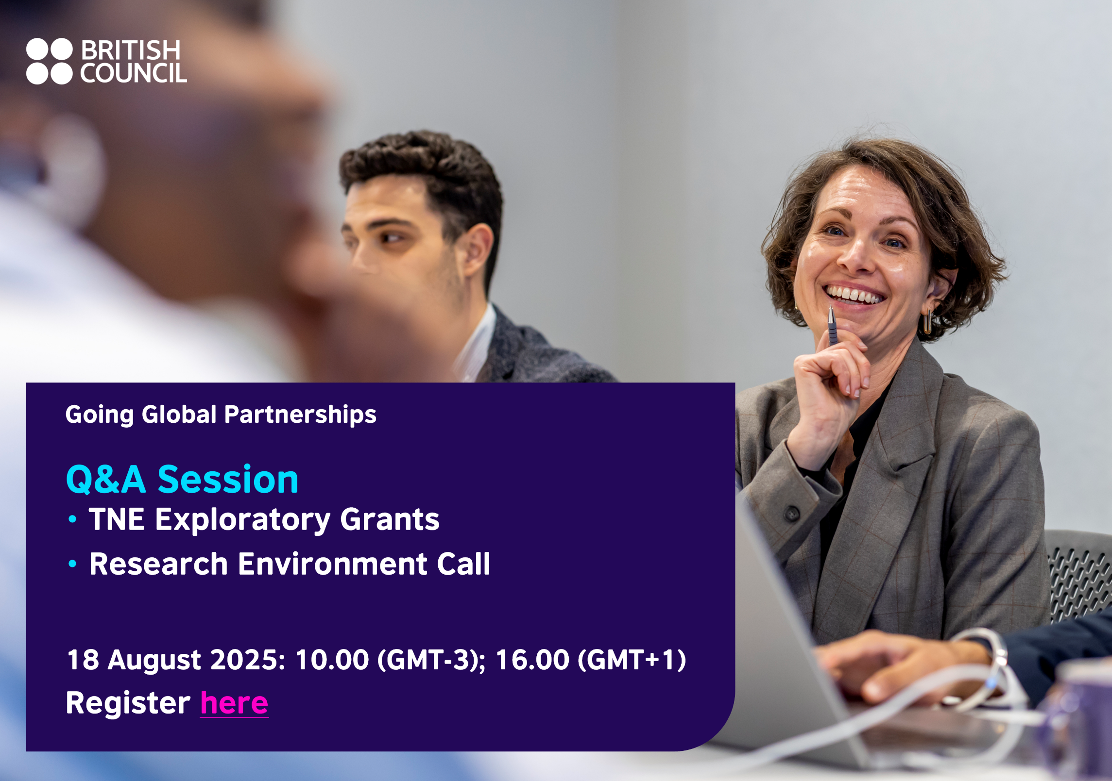 No dia 18 de agosto será realizado um webinário para apresentar a Research Environments Call 2025-26 e os TNE Exploratory Grants 2025 e tirar dúvidas a respeito. Além de serem apresentados dados preliminares sobre o Mapeamento de Colaborações entre Brasil e Reino Unido, estudo comissionado pelo British Council no Brasil.