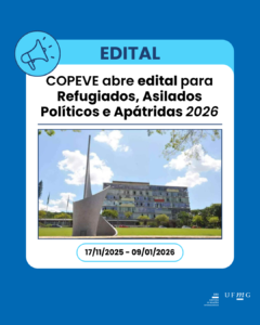 A Comissão Permanente do Vestibular da UFMG (COPEVE) iniciou nesta segunda-feira, 17/11, as inscrições, exclusivamente pela Internet, ao Processo Seletivo 2026 UFMG para ingresso nos cursos presenciais de graduação, destinados a refugiados, asilados políticos, apátridas, portadores de visto temporário de acolhida humanitária, portadores de autorização de residência para fins de acolhida humanitária, conforme relacionado nos Quadros I e II do Edital.