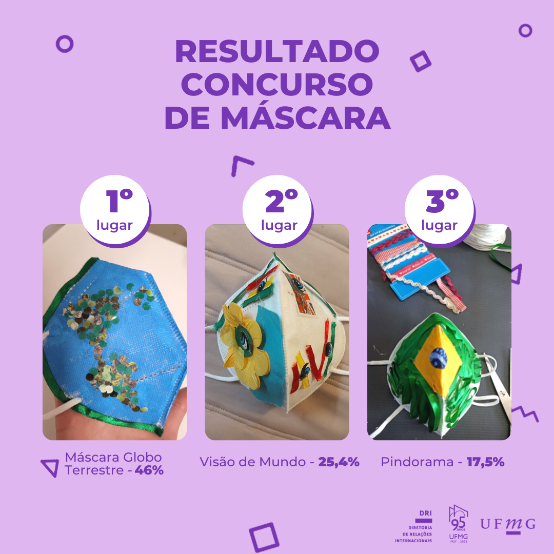 A Diretoria de Relações Internacionais (DRI) da Universidade Federal de Minas Gerais (UFMG) torna público o resultado do concurso “Com que máscara de proteção você vem para a UFMG?”, com a temática “Internacionalização”. A iniciativa teve como objetivo incentivar o uso obrigatório das máscaras de proteção como medida de cuidado sanitário contra a Covid-19.