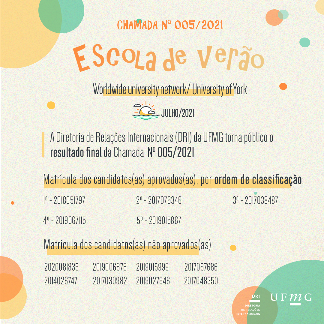 A Diretoria de Relações Internacionais (DRI) da UFMG torna público o resultado final da Chamada 005/2021 – ESCOLA DE VERÃO VIRTUAL – WORLDWIDE UNIVERSITY NETWORK / UNIVERSITY OF YORK – JULHO/2021.