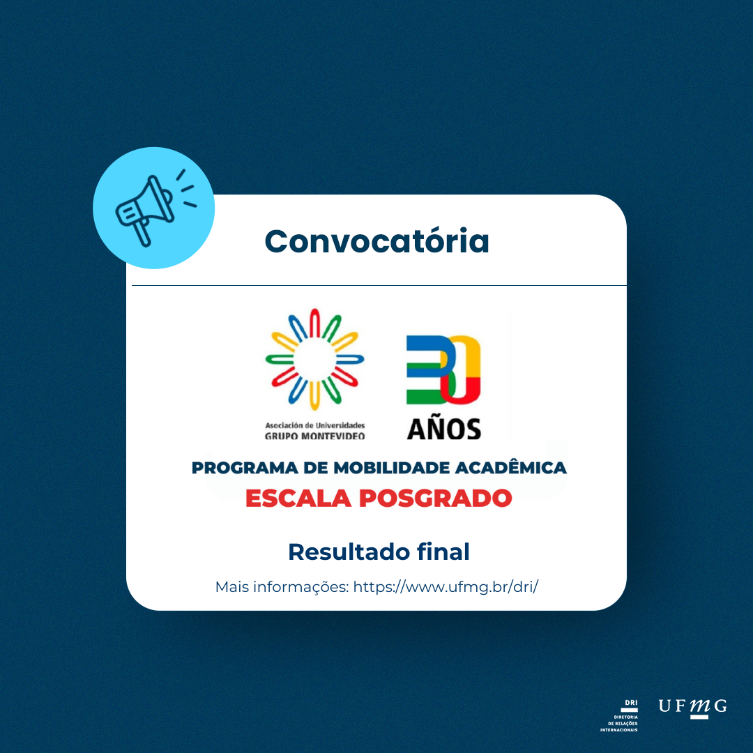 A Diretoria de Relações Internacionais (DRI) divulga o resultado final, após análise das candidaturas pelas universidades destino, da Chamada 13_2023 do Programa Escala Posgrado da Associação de Universidades do Grupo Montevidéu (AUGM). Os aprovados deverão aguardar as próximas comunicações.