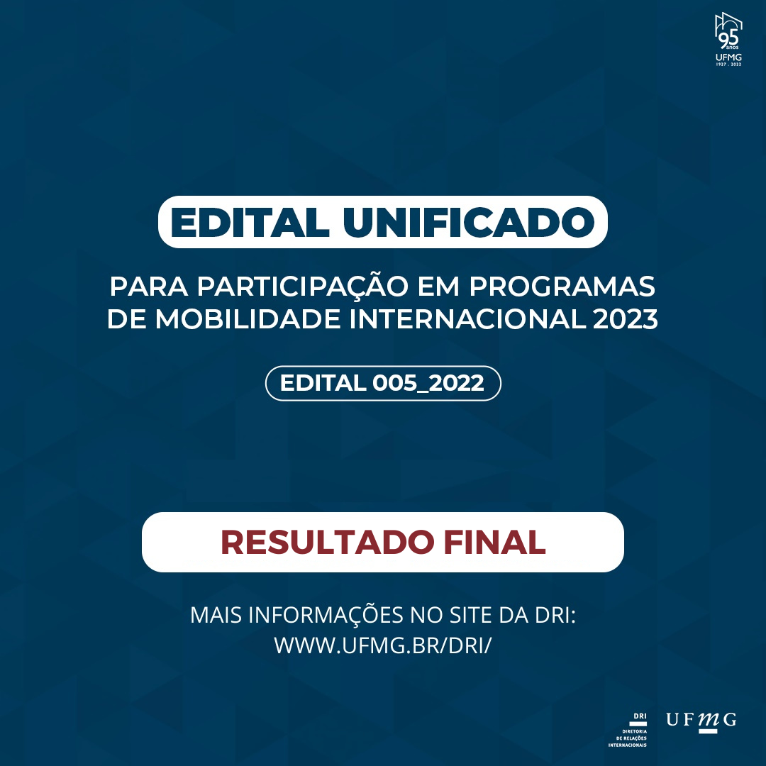 A Diretoria de Relações Internacionais (DRI) torna público o Resultado final, após análise de recursos, referente ao Edital Unificado para Participação em Programas de Mobilidade Internacional 2022/2023 – Edital 005_2022.
