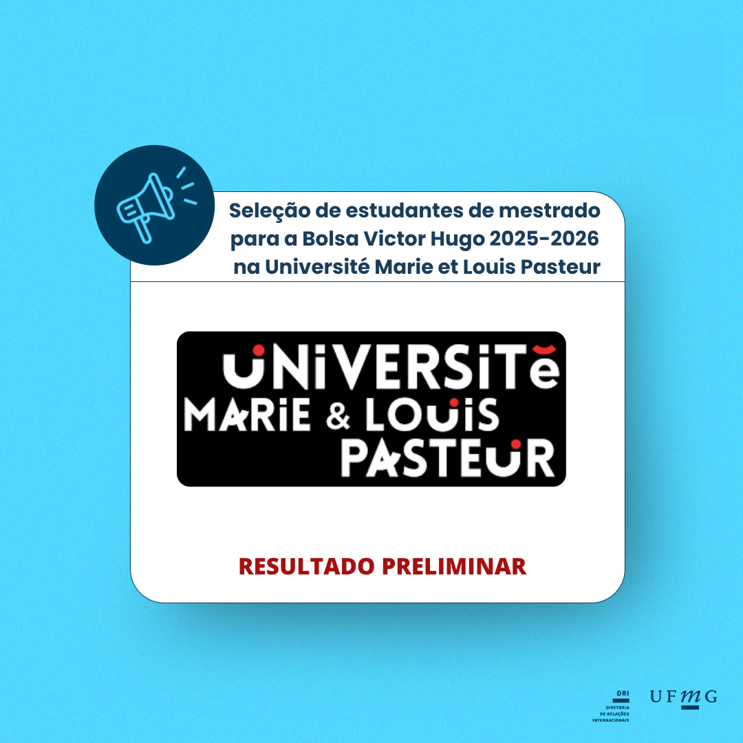 (UFMG) torna público o Resultado Preliminar da Chamada 03/2025 – Bolsa Victor Hugo 2025-2026 na Université Marie et Louis Pasteur (antiga Université de Franche-Comté), França, para estudantes de mestrado da UFMG.