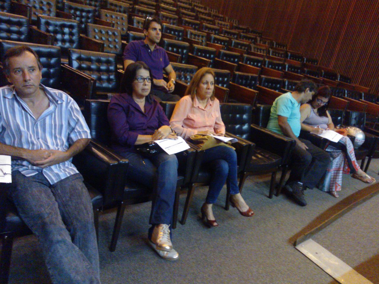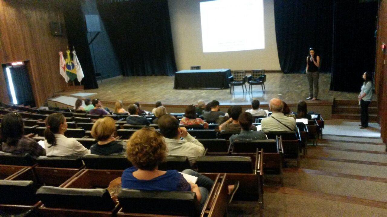 Professora Míriam, Diretora Adjunta da Diretoria de Relações Internacionais, no auditório da Reitoria, conversando com as famílias que irão receber os estudantes estrangeiros do segundo semestre de 2015.